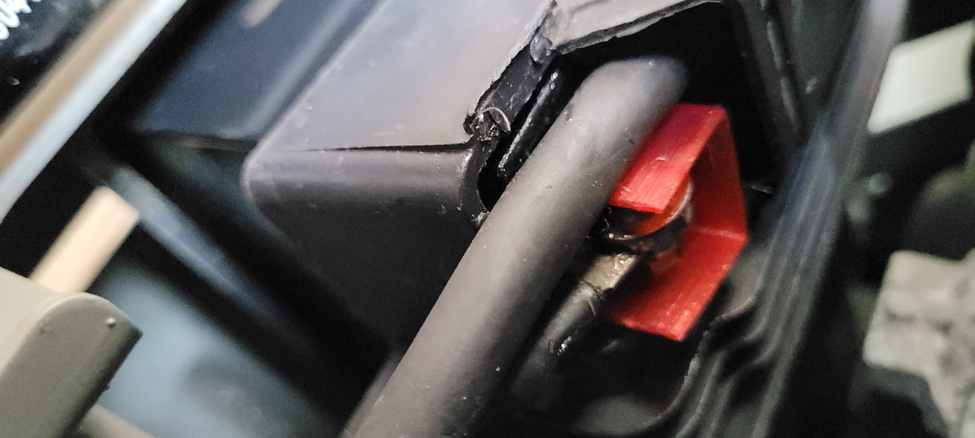 Allerdings fand ich es nicht so toll, dass das + Kabel an der - Polverschraubung entlangführt. Ich denke das kann scheuern und habe deswegen aus meinem unendlichen Fundus an 3d Fehldrucken schnell etwas isolierendes, scheuerresistentes gefunden und so das Kabel vom -Pol scheuerresistent getrennt.
