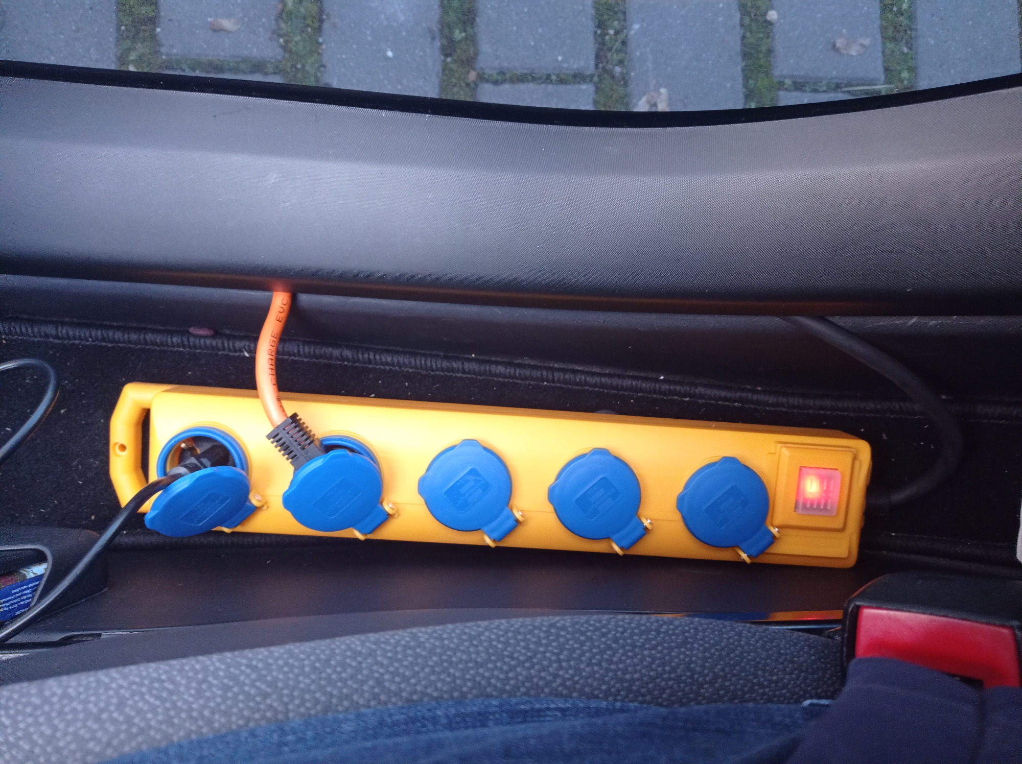 Ergänzung: Der Stecker vom Fahrzeug-Lader ( orange Leitung ) ist in der falschen Steckdose, hohe Lasten sollten immer direkt neben dem Schalter eingesteckt werden. ( Bei einer kurzfristigen Notlage z.B.)