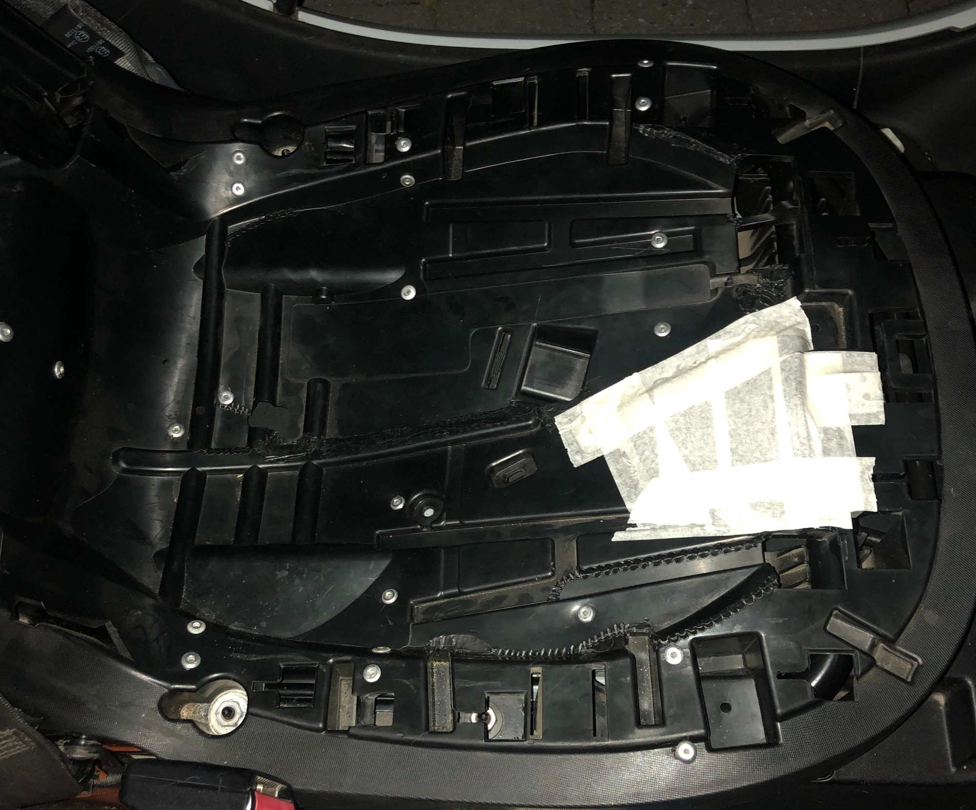 Das mit tape abgeklebtes dreieck ist mit ne metalplatte unterstutzt uber die ganze breite da das plastic teil weg war. In die hintergebliebene recesse habe ich aus schaumgummi ne auffullung gemacht und verklebt und der tape ist nur noch da damit geine scharfe kanten im sitz sneiden können... Optisch keine perfecte reparatur aber besser konnte ich es nicht machen weil mir das teil gefehlt hatte .Die ganze risse habe ich "geschweist" mit einen lötbolzen auf niederige temperatur an beide seiten (oben und unten)