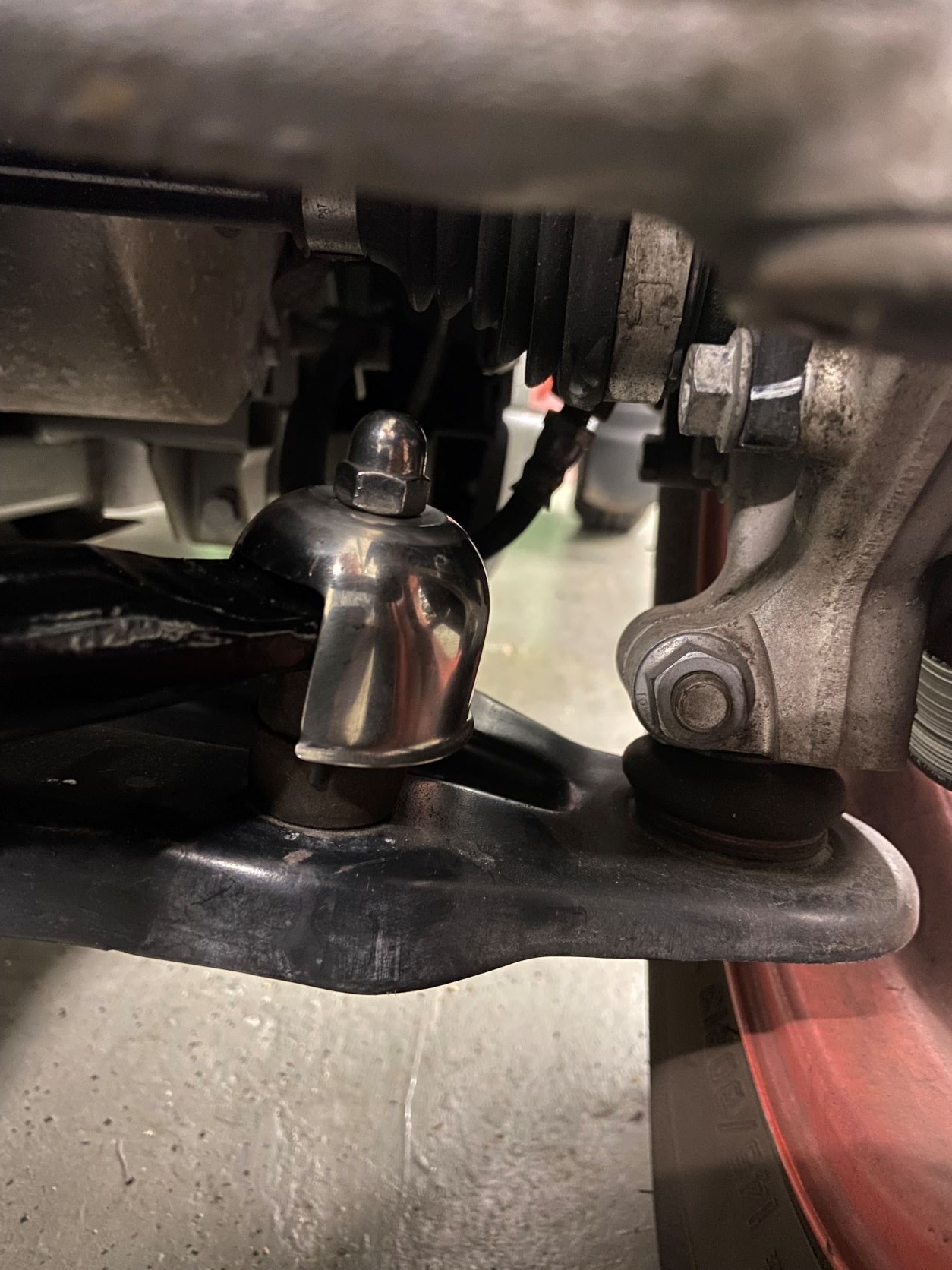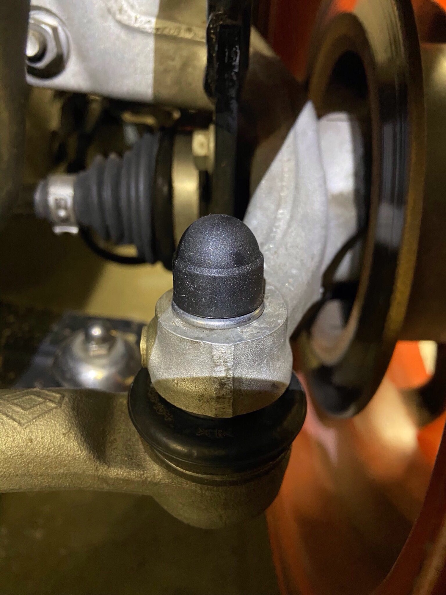 Das sieht am Achsschenkel dann so aus. ( Wer im Bild alle 3 Kappen findet darf sie behalten