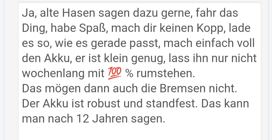 Ausserdem könnte man damit so Timen, dass der Akku nur zu ca. 80% geladen wird, das würde bei unserer täglichen Strecke reichen.