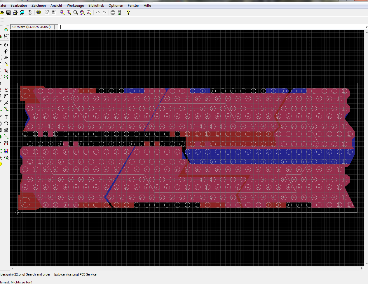 Dort wurden die Zellen mit einer Oberfräse elektrisch getrennt und mit einer eingelöteten Brücke in Reihe geschaltet. Das Prinzip wollte ich übernehmen, doch leider passt die dort eingezeichnete Schnittlinie nur für die voll bestückten Module mit 74 Zellen aus dem Model S mit 85kWh. Also habe ich kurzerhand den Akku in Eagle nachgezeichnet, um die Lage der korrekten Schnittlinie zu bestimmen: