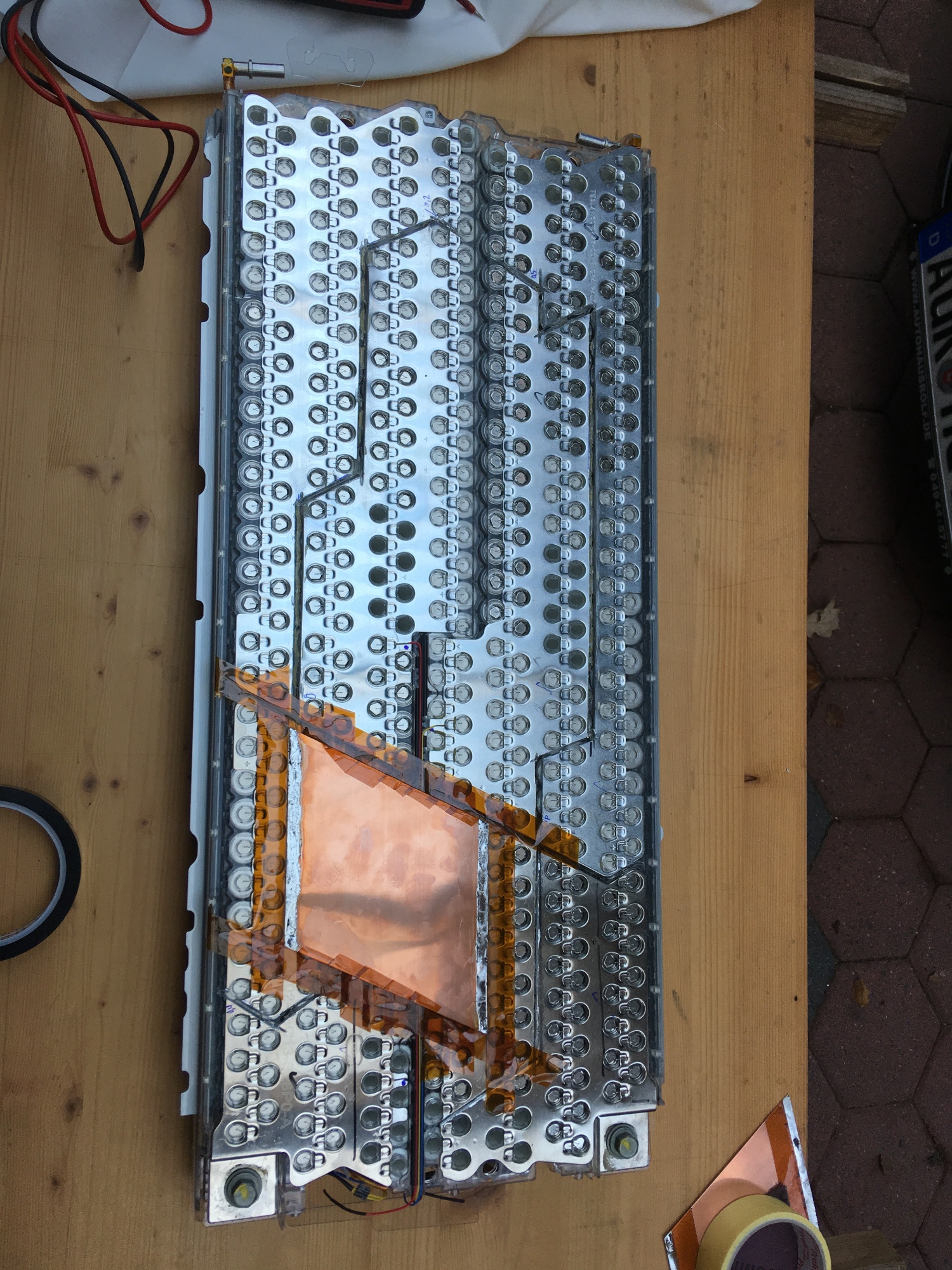 Merke: Wenn man einen Tesla-Akku kauft, sollte man immer auch gleich die Isolierplatten, die in der Original-Konfiguration verbaut werden, mitnehmen. Man kann diese wunderbar als neuen Schutz wiederverwerten. Allerdings braucht man trotzdem noch je Akku eine weitere "Platte" für die Unterseite. Hier kam bei mir 0,2mm GFK zum Einsatz. Das verwendete Klebeband ist übrigens aus dem Baubereich und dient eigentlich zum Abkleben von Dampfsperren. Wo man es aufsetzt, klebt es sofort und dauerhaft. Es hält nicht nur die Isolierplatten, sondern sichert zusätzlich auch die BMS-Leitungen, die ich an den Außenseiten vom Akku montiert habe: .