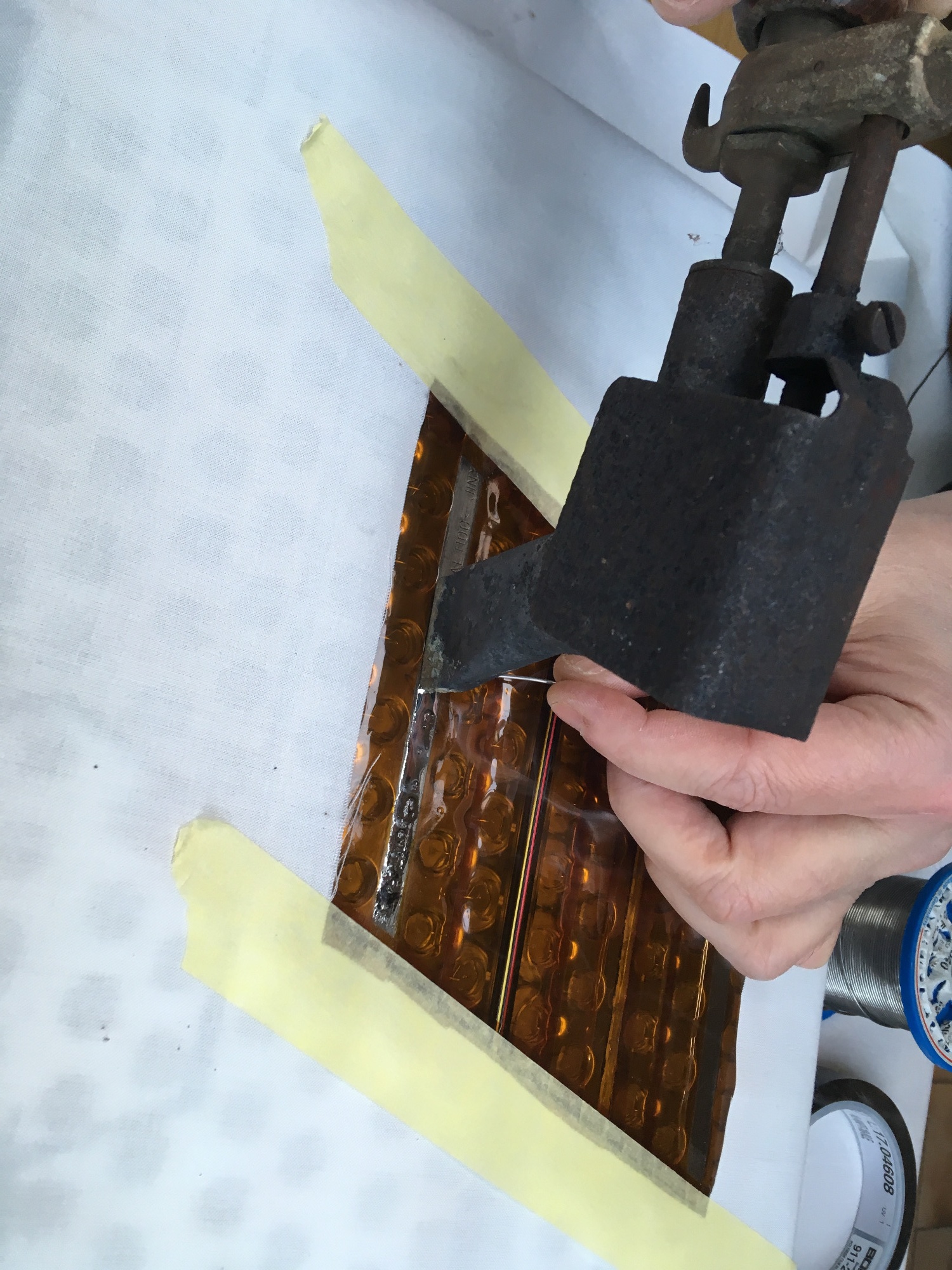 Die Lötflächen wurden vorher mit hitzebeständigem Kapton-Tape eingegrenzt, sowie der unter der einzulötenden Brücke liegende Pol vor Kurzschluss geschützt. Um den Rest des Akkus vor tropfendem Lötzinn zu schützen, habe ich aus Stoff eine "OP-Schürze" gebastelt