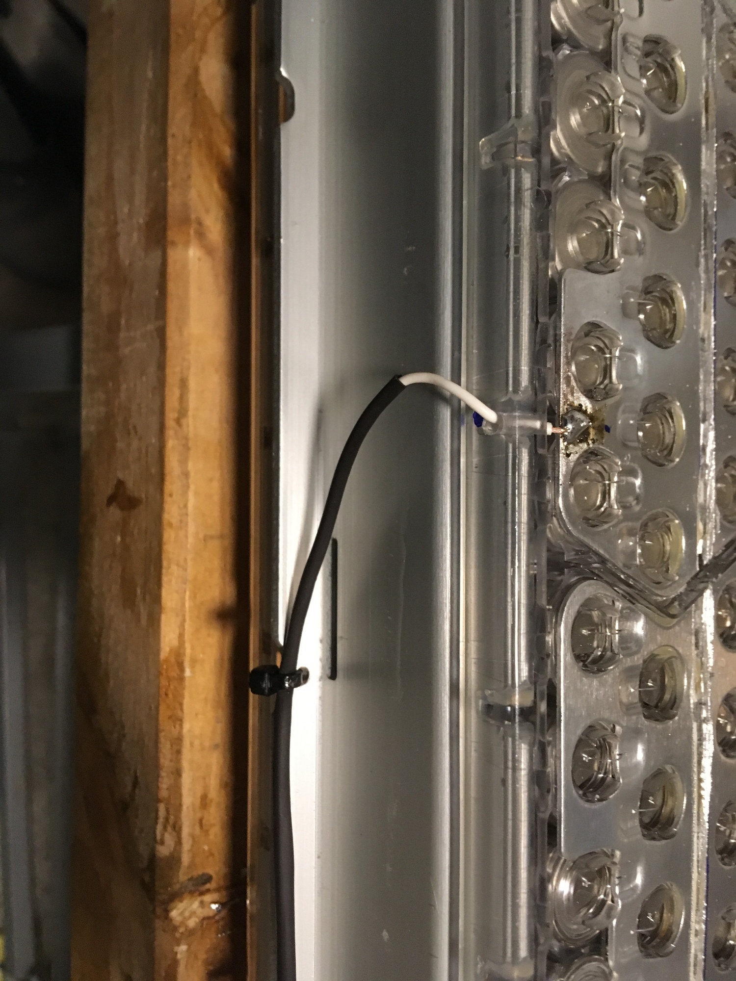 Vermutlich hat sich der unter den Leitblechen liegende Kunststoff durch das Sägen so stark erhitzt, dass der darauf fallende Staub eine leitfähige Schicht ergeben hat. Nach dem Entfernen der Stege war kein Kurzschluss mehr zu messen, so dass es mit dem Einlöten der Brücke zur Verbindung der beiden Zweige weitergehen konnte. Da es sich bei den Blechen um Aluminium handelt, welches ja bekanntermaßen aufgrund der sich sofort nach der Bearbeitung bildenden Oxidschicht keine Lötverbindung eingehen will, musste ich erstmal Vorversuche machen. Ein von mir extra dafür besorgtes Alu-Lot (PB80SN18AG2) hat sich als ungeeignet herausgestellt. Was geholfen hat, war ein einfacher Trick: Ein wenig Öl auf die Lötstelle geträufelt, dann mit Öl geschliffen und sofort danach mit konventionellen Elektroniklot verzinnt. Was man allerdings braucht, ist ein leistungsfähiger Hammerlötkolben, denn die Bleche wirken wie ein guter Kühlkörper...