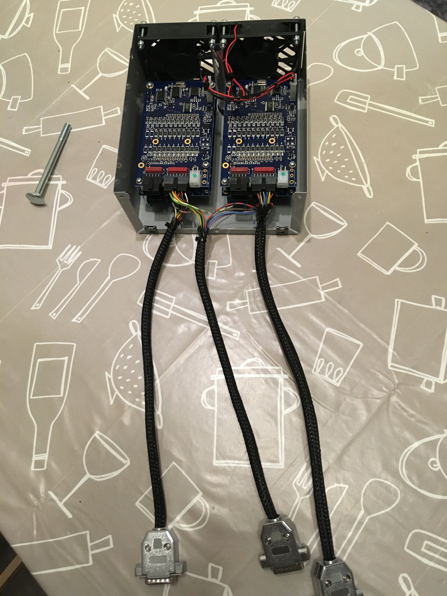 Alle Boards sind mit 12V, Masse, CANhigh und CANlow verbunden. Es müsste also möglich sein, den alten Kabelbaum des Laders, der zu den Temperatursensoren führte, so umzubauen, dass dieser für diese Konfiguration passt.