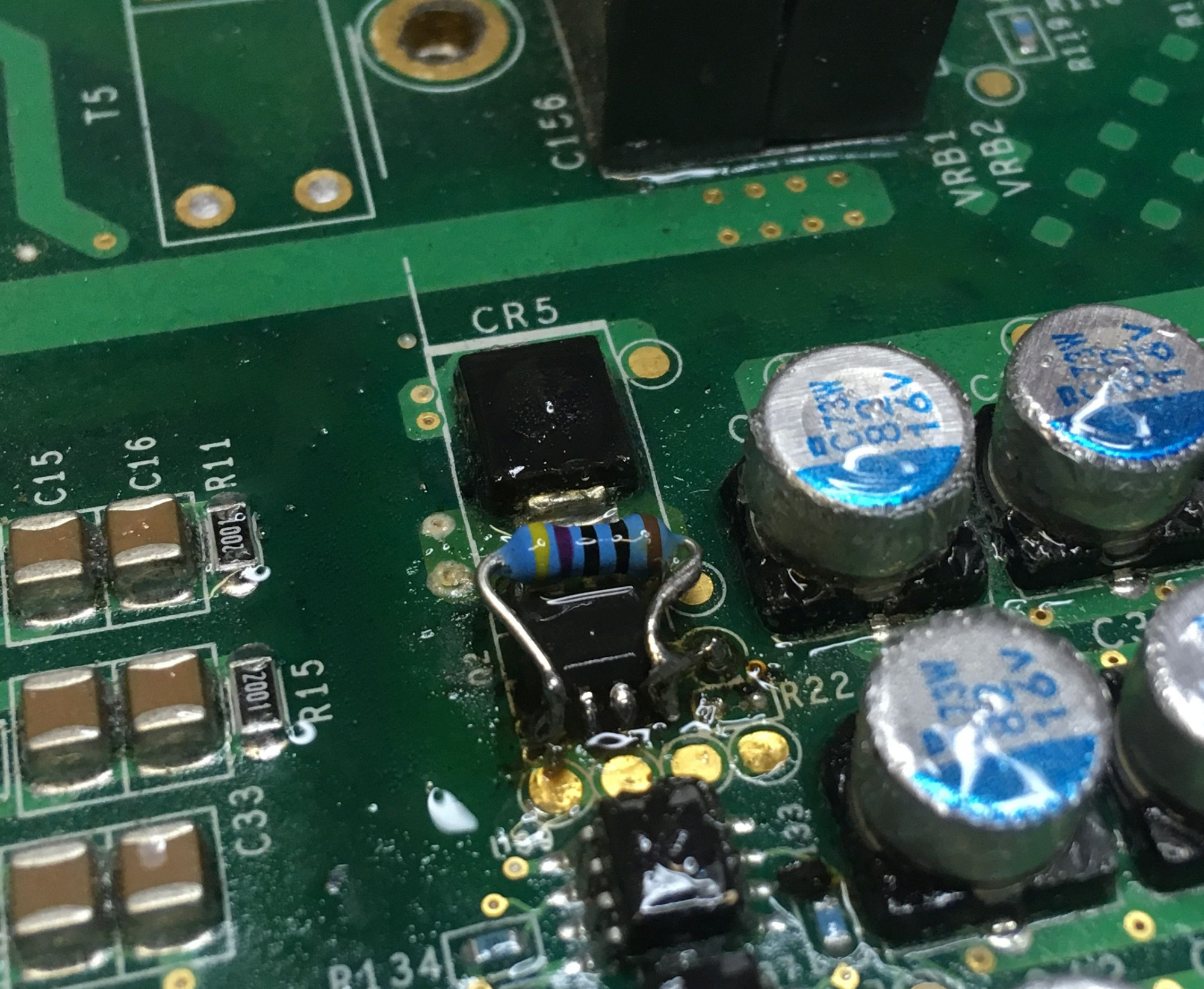 Gegenüber Uwes altem Board scheine ich ursprünglich eine neuere Version des Controllers gehabt zu haben. Es ist eine kleine Platine huckepack eingelötet die -soviel ich weiß- den Ruhestromverbrauch des Rollers senken soll. Zum anderen wurde -ebenfalls Huckepack- ein kleinerer Vorwiderstand (499 Ohm statt 1kOhm) für den Lüfter-MOSFET verbaut.