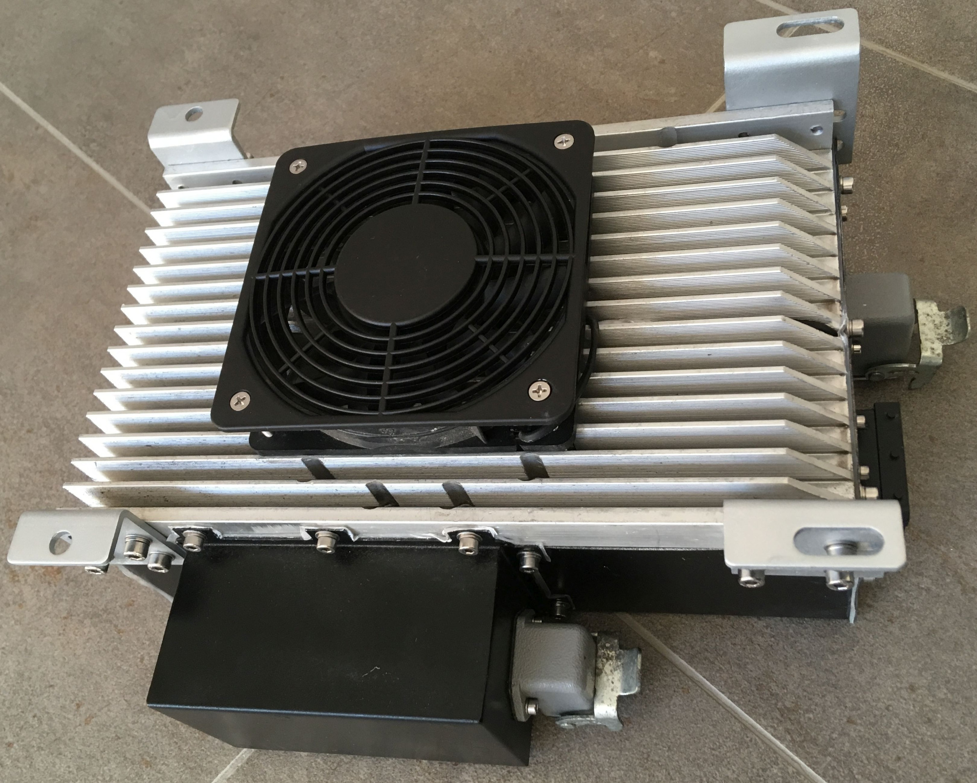 Fertig. Nun konnte der Motorcontroller wieder eingebaut und getestet werden. Die zum EVPS-Lader passende Firmware 1021 wurde eingespielt und schon konnte wieder ein Ladevorgang gestartet werden. Dieser brach allerdings nach kurzer Zeit mit der Meldung "no tS" (Keine Temperatursensoren) wieder ab. Logisch - die Sensoren fehlten ja. Dann wurde das Ladegerät wieder ins Gehäuse eingepackt. Da dieses vorher ziemlich verrostet war, habe ich es kurzerhand geschliffen, mit Zinkspray und schwarzem Lack lackiert. Zusätzlich habe ich die Schrauben gegen welche aus Edelstahl getauscht, da mir beim Zerlegen zwei Köpfe der alten Schrauben abgerissen waren