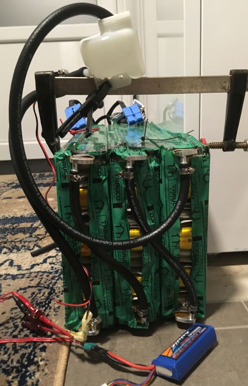 Heute Abend habe ich einen kleinen Testaufbau gebastelt. Alles, was man dazu braucht, ist etwas Schlauch, ein paar Schlauchschellen, eine Pumpe und einen Ausgleichsbehälter. Als Stromversorgung dient in der Testphase ein 3-Zellen-LiPo: