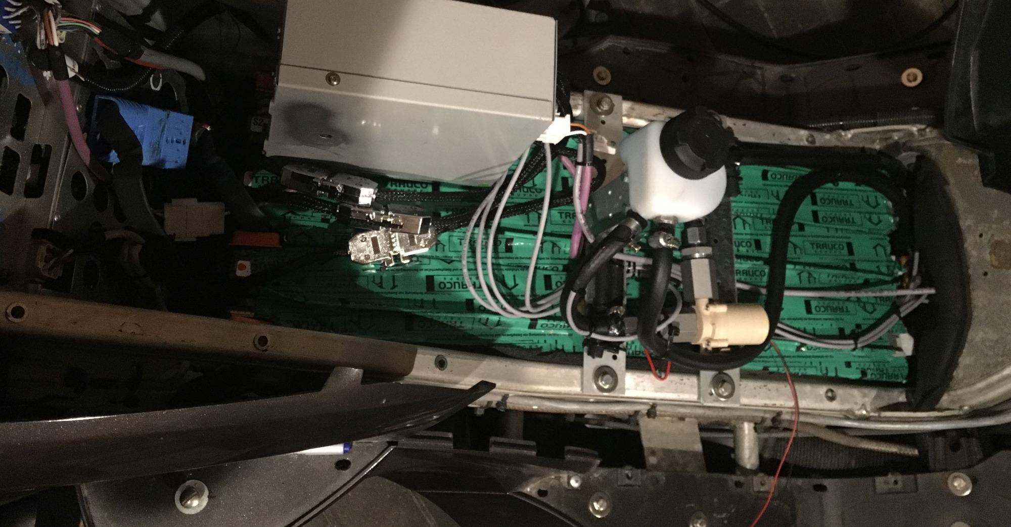 Mittlerweile wurde die Pumpe gegen eine etwas stärkere getauscht. Mit den Resten an Wasser hat sich das Entlüften der Wärmeverteilung schwieriger dargestellt als anfangs gedacht. Letztenendes habe ich mit dem Gartenschlauch ca. 40l Wasser durch die Akkus gepumpt, bis das Blubbern und im Akku und die Luftblasen am Ablaufschlauch verschwanden. Danach konnte ich die Pumpe in Betrieb genommen werden und so lange Kühlmittel nachfüllen, bis kein (reines) Wasser mehr drin war.