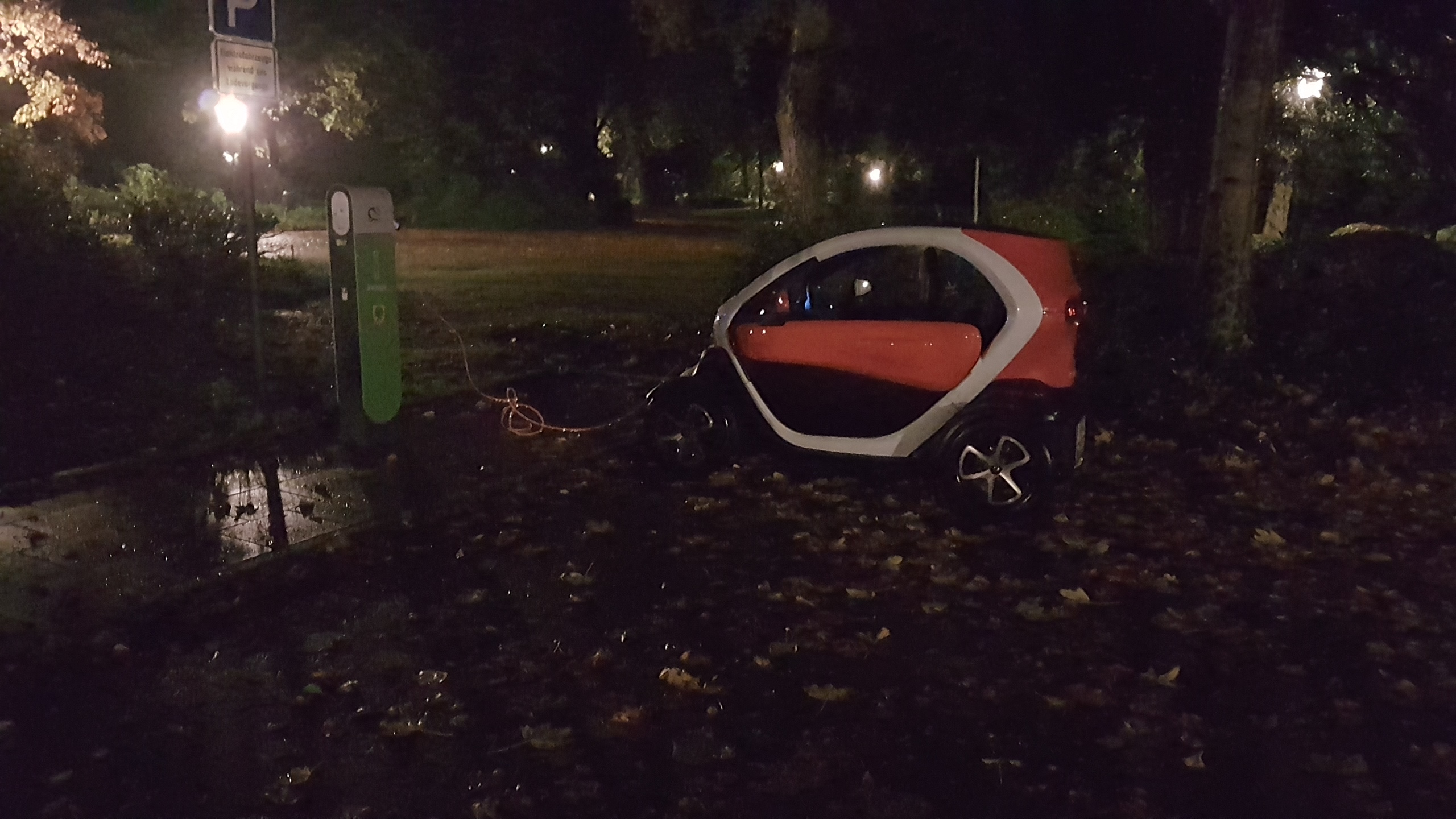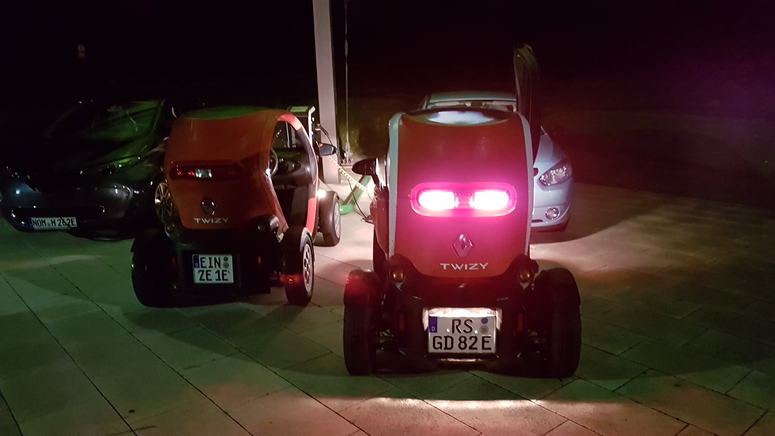 In Northeim am Rathaus sind alle Säulen von Gemeindeautos beglegt, fand ich jetzt nicht so lustig, na ab zur Alternaive beim VW-AH, sch*** wieder nur Kabel und ich war durch den Dauerregen auf letzten Elektronen, nächster Versuch bei den Fossilbrennstoffverteilern, diesmal durfte ich laden, der Klein konnte sich sogar unterstellen, leider war es nun schon 21:00 Uhr und die Tanke schliesst um 22:00, hatte aber den Tip das es beim Röno AH eine Ladesäule gibt, hatte ich im Routenplaner übersehen, sonst wäre das eh die erste Wahl gewesen.