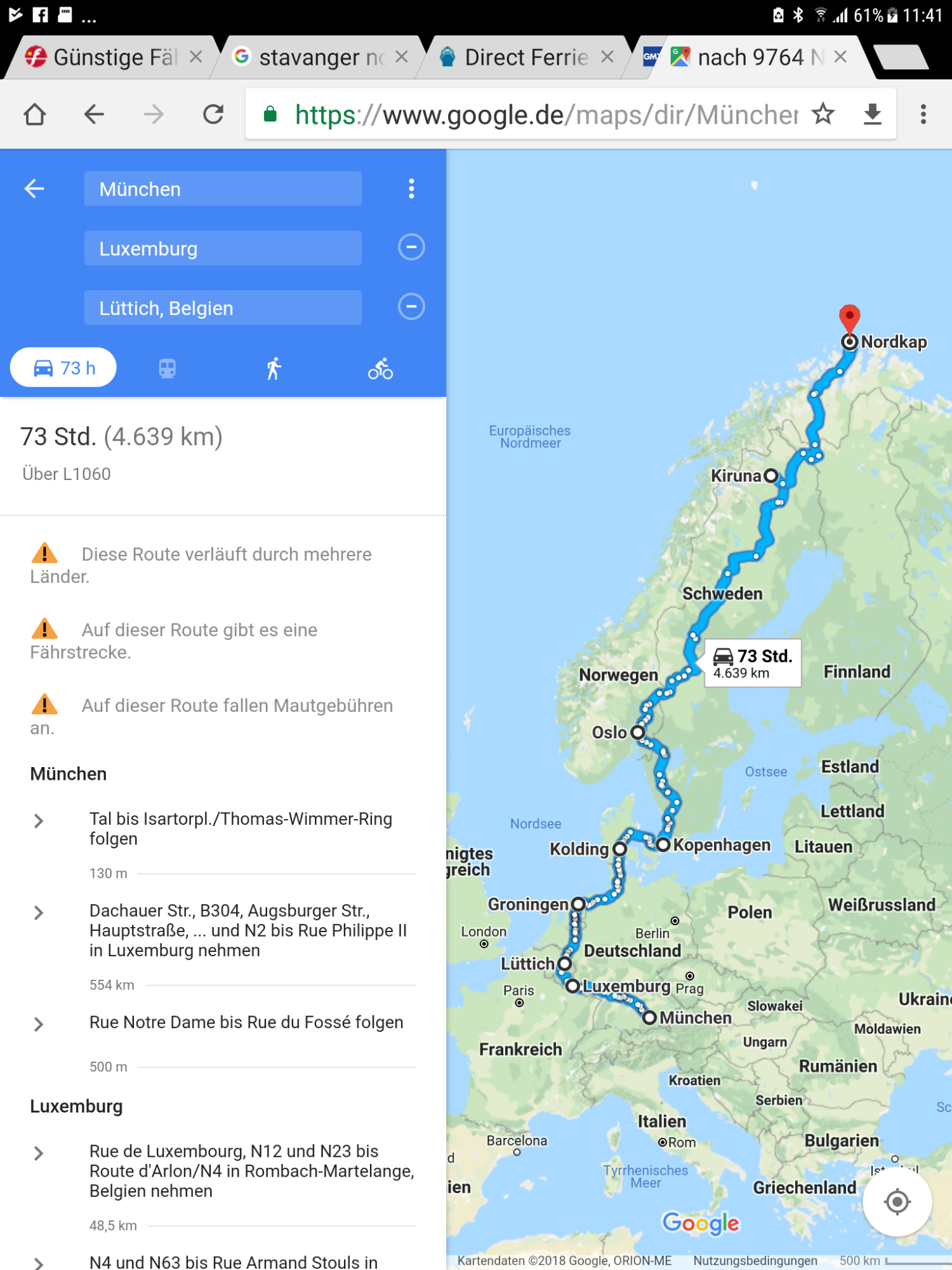Der Plan ist in der letzen Juliwoche über Luxenburg,Belgien, Holland, Dänemark zum Nordkap zu fahren und von dort (weil die Zeit knapp ist) mit der Fähre nach Bergen bzw. Hirtshals wieder flott heim zu kommen (Anfang September).