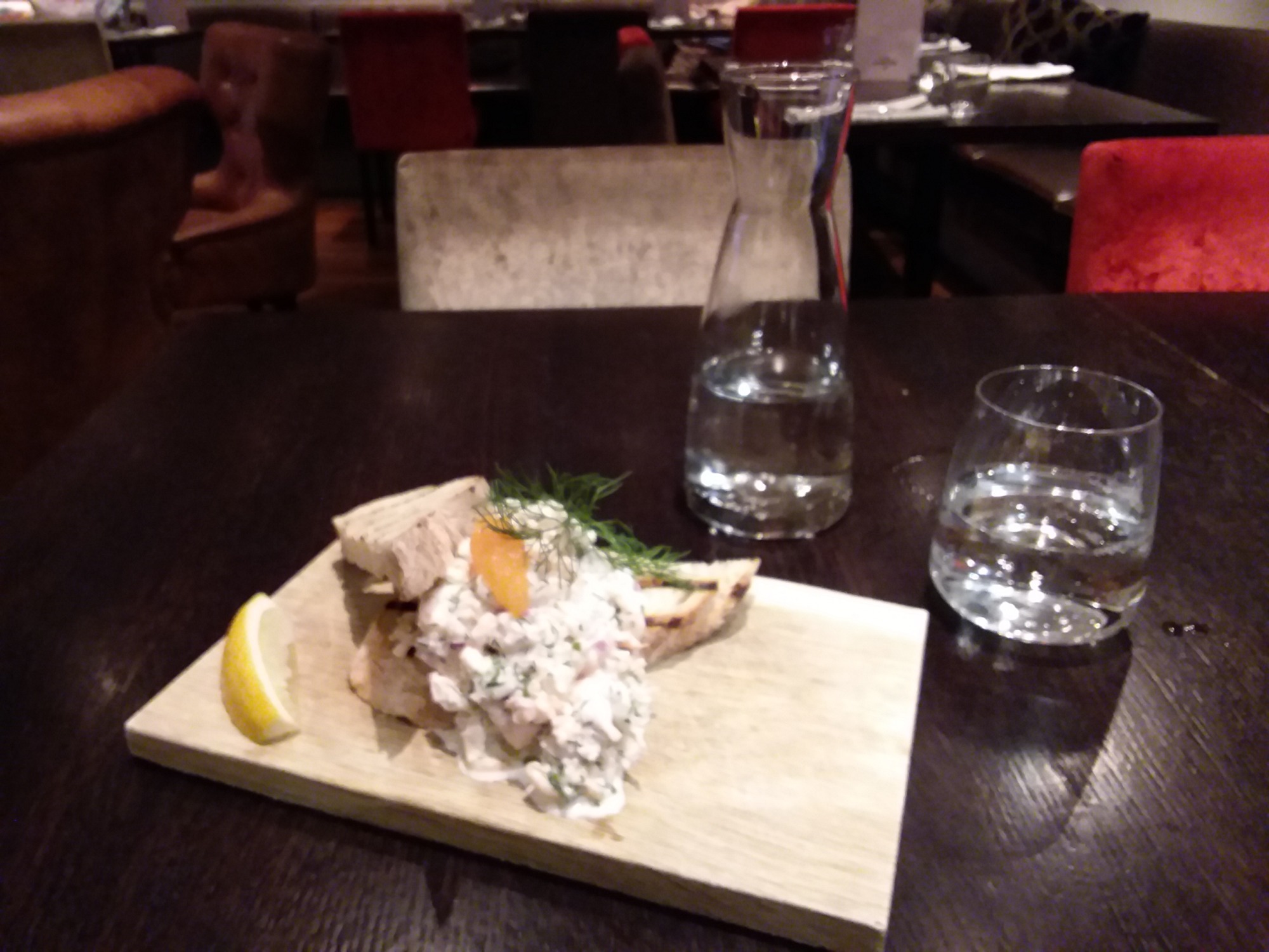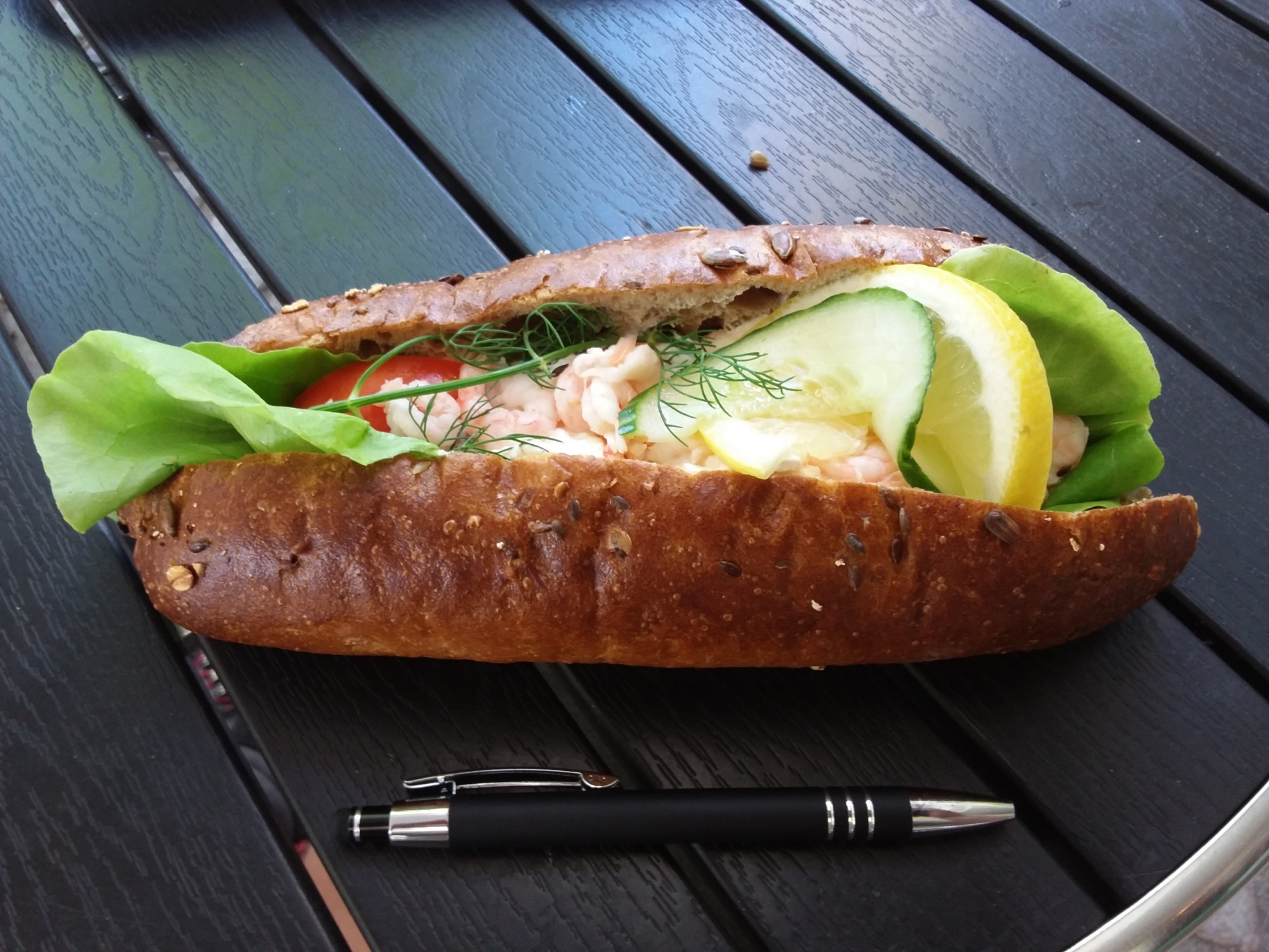 Es gab handgezwirbelten schwedischen Krabbencocktail (mit Lachs aus der Bucht und Gemuese aus dem Garten)....dann gekochte Schrimmpes