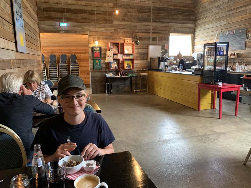 Da die heutige Strecke nicht allzu lange sein wird, schlafen wir etwas länger und machen uns nach einem ausgiebigen Frühstück (Toast mit Erdnussbutter, leider creamy und nicht crunchy) auf die 19 km lange Strecke nach Breiðdalsvík. Dort fragen wir in einem Cafe+Supermarkt, ob wir laden dürfen. Die Betreiberin des Cafes ist nicht wirklich überzeugt davon, lässt es dann aber doch zu. Wir trinken einen Kaffee und es gibt Kuchen.