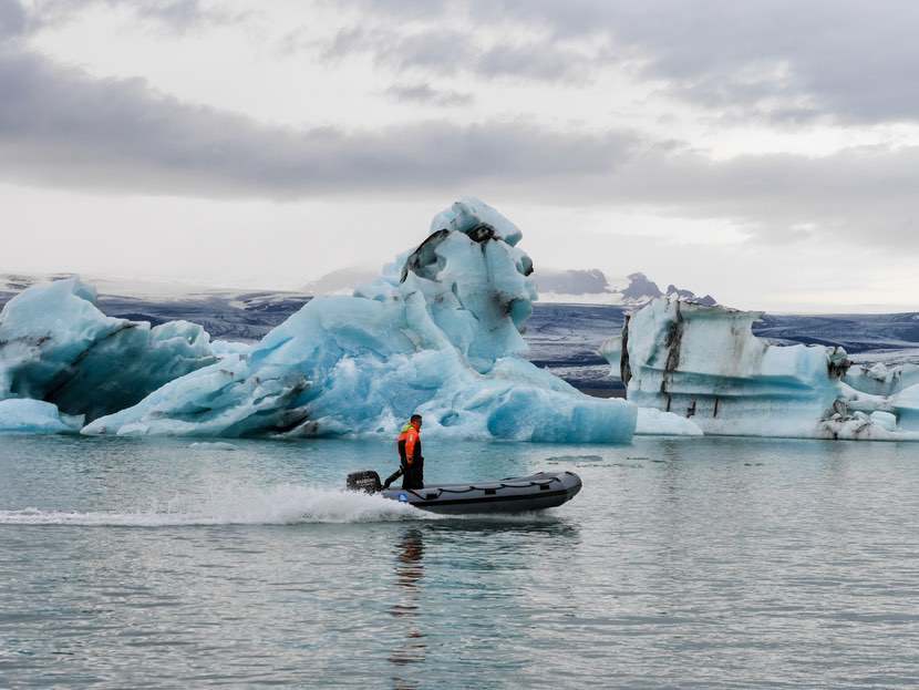 Wir überlegen, eine Tour zu nehmen. Es gibt Touren in Amphibienfahrzeugen und in Schlauchboten.. Da Jökulsarlon aber heute nicht allzuviel Eisberge hat, entscheiden wir uns gegen eine Tour. Wir laufen am Seeufer entlang und danach zum Meer. Normalerweise stranden dort dann auch einige Eisberge, heute aber leider nicht.