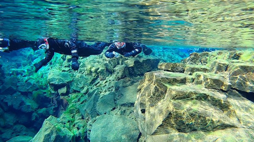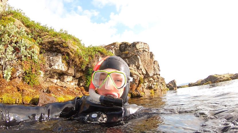 Die Silfra-Spalte ist durch das Auseinanderdriften der eurasischen und der nordamerikanischen Kontinentalplatte entstanden. Sie wird durch das Schmelzwasser des Langjökull Gletschers gespeist. Das Wasser wird über 50 km durch poröses Lavagestein gefiltert, ist glasklar und weitgehend ohne Schwebstoffe. Die Wassertemperatur beträgt 2 bis 4° Celsius. Man schnorchelt zwischen zwei Kontinenten. Wir sind die Schwebstoffe.