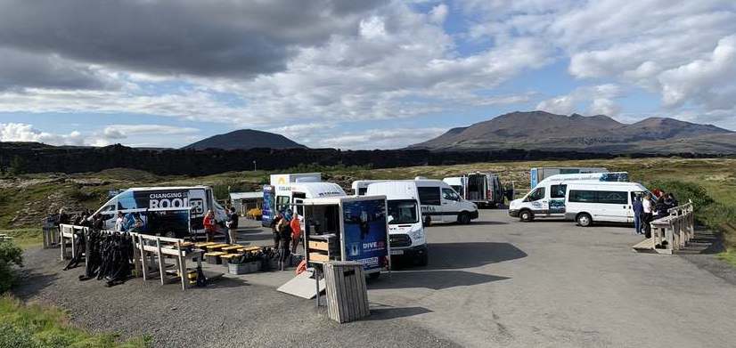Wir kommen rund eine Stunde Später in Þingvellir an der Tauchbasis an. Neben dem Schnorcheln kann man natürlich auch tauchen gehen. Wir bekommen unsere Ausrüstung, wir ziehen sie an bzw. man hilft uns. Das Wetter ist perfekt, die Sonne scheint noch immer.