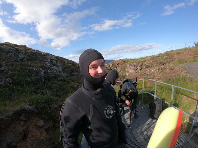 Irgendwann gehen wir, mit Neoprenganzkörperanzügen, Masken, Flossen und Handschuhen zur Silfra-Spalte. Der Anzug schnürt extrem am Hals und an den Armen ab, damit kein Wasser eindringen kann. Auf den Kopf kommt die Haube, die Hände sind in Handschuhe eingepackt und man schwitzt ausserhalb des Wassers ganz gewaltig.
