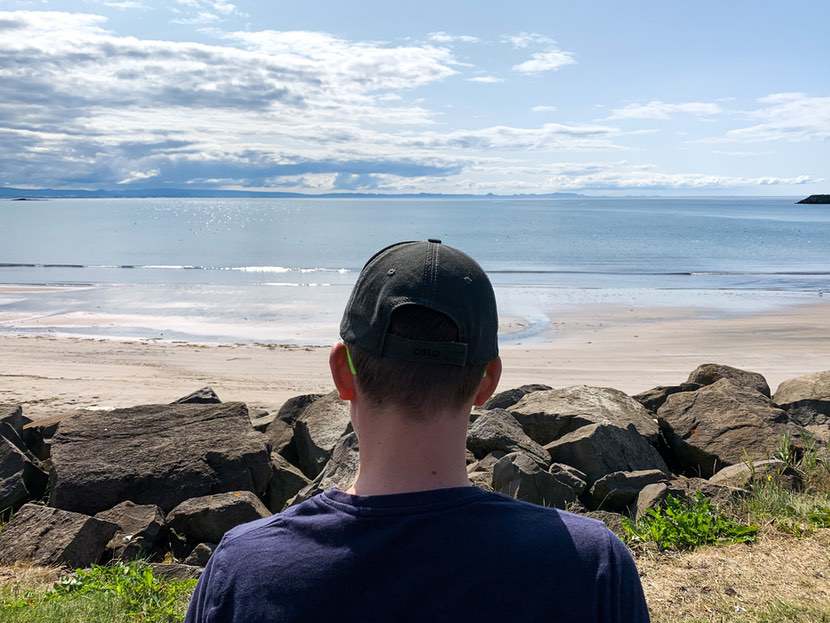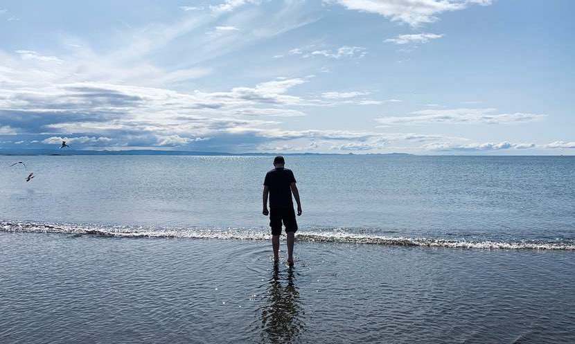 Es gibt am Strand Duschen und es gibt einen Hot Pot. Lars zieht sich die Schuhe aus und geht mit den Füßen ins Meer.