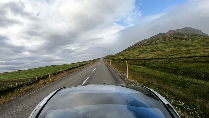 Es wird Abend und wir fahren, nachdem wir die Hochlandpiste mit dem Defender zurückgelassen haben, mit Silja in Stephans Volvo zurück nach Egilsstaðir, wo wir in den Twizy umsteigen. Die Rezeption unseres Hostels in Seyðisfjörður hat nur bis 21 Uhr geöffnet und wir müssen noch fragen, ob wir laden können.