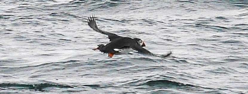 Wir sehen noch einige Papageitaucher, die auf ihre wenig elegante Art mit schnellem Flügelschlag über das Wasser fliegen. Die sind einfach putzig,