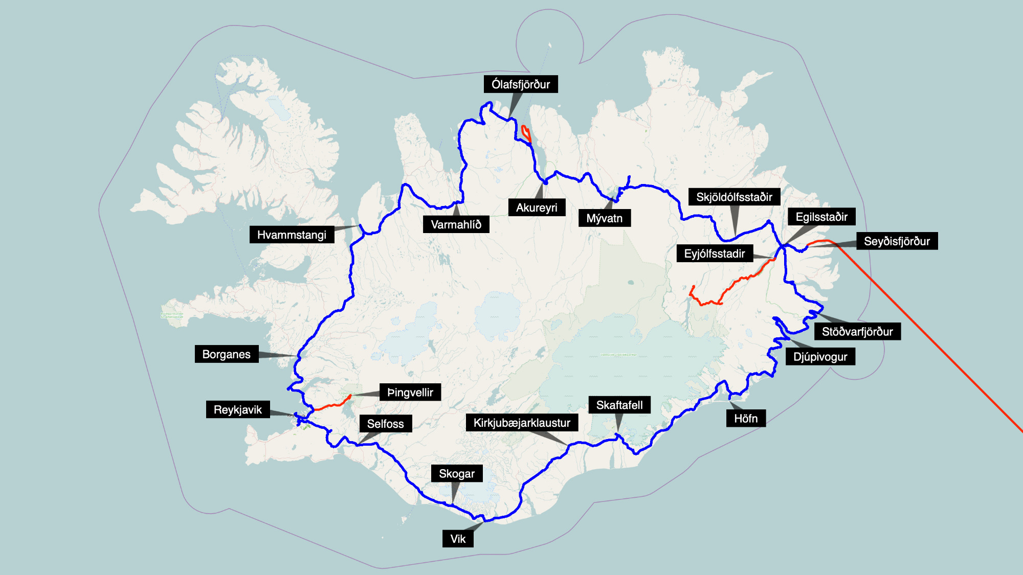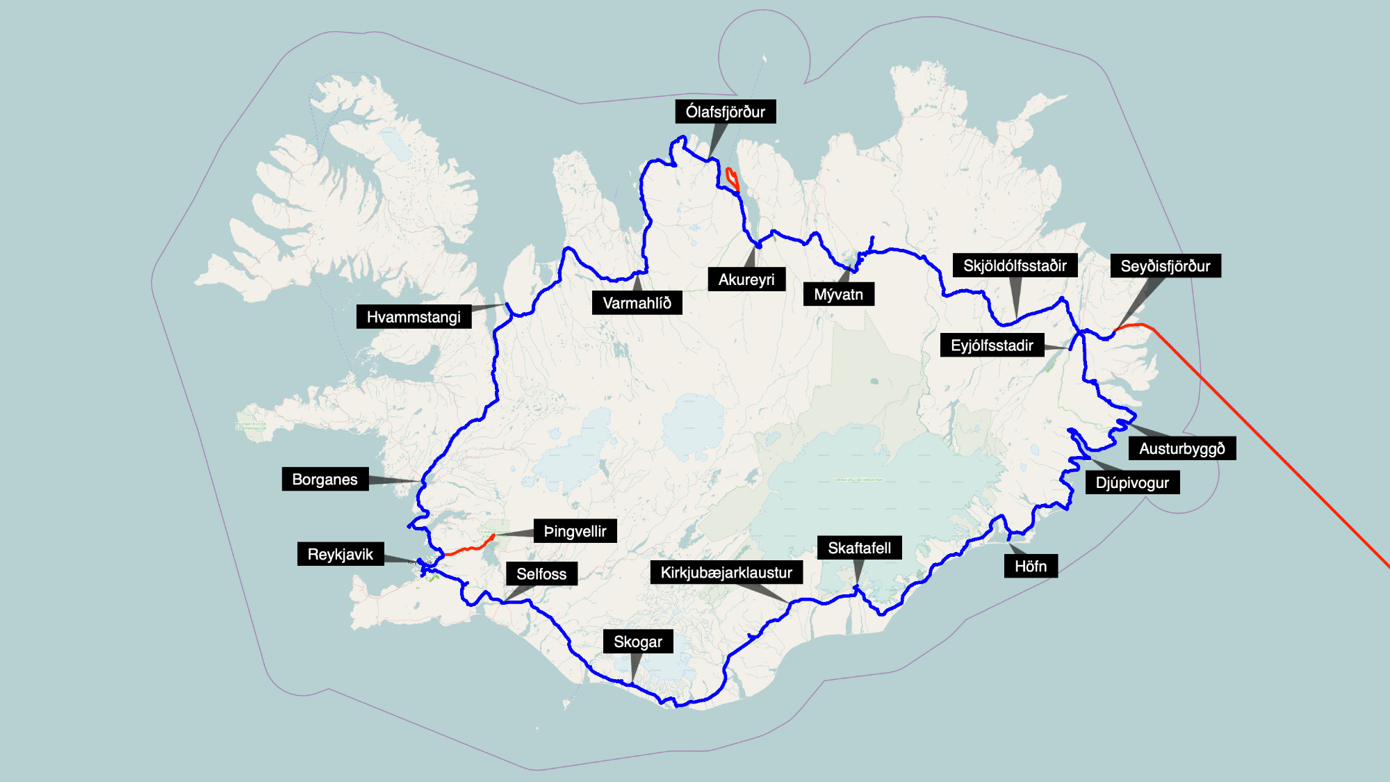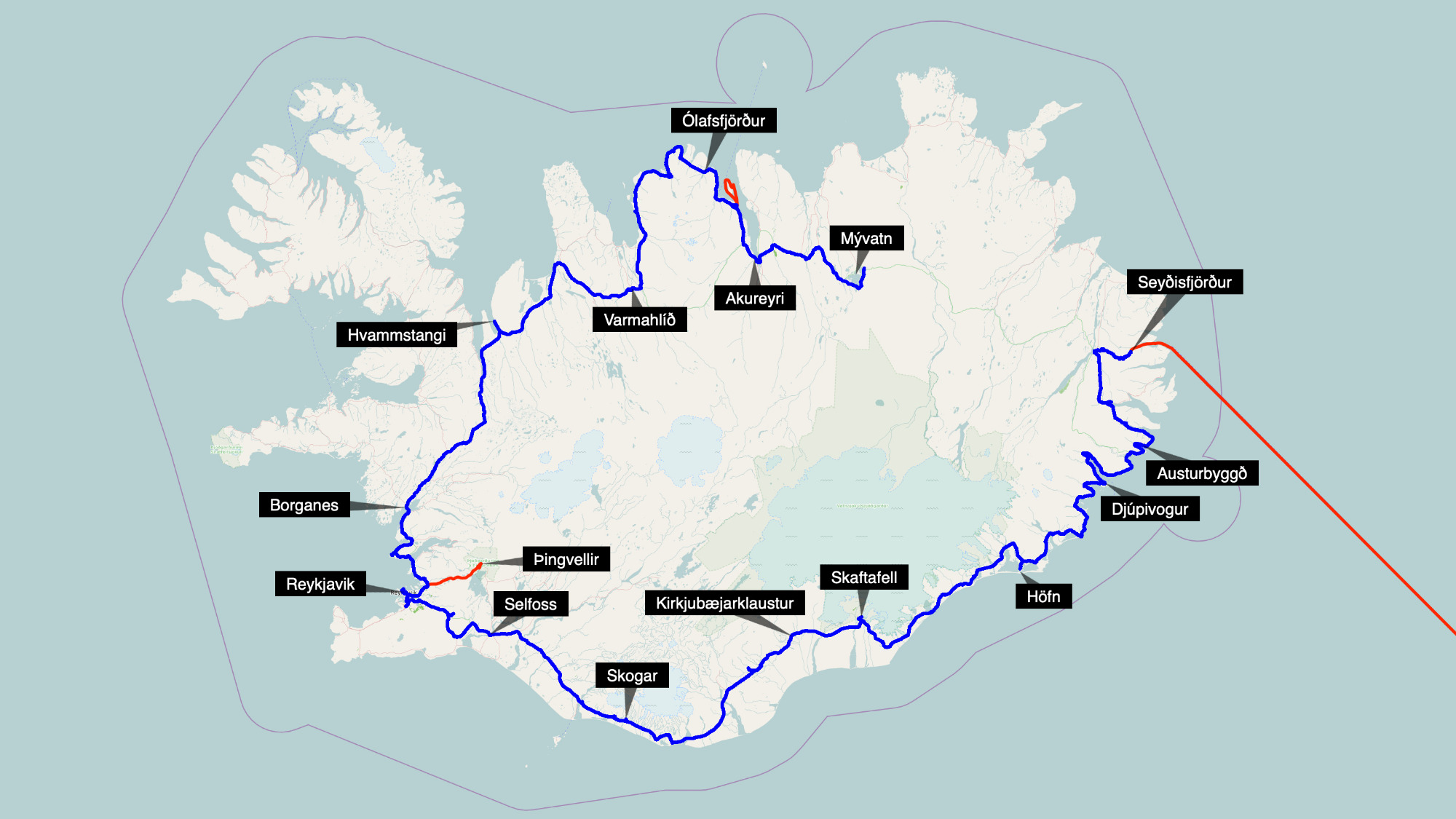 Wir verabschieden uns von Island. 1789 km haben wir auf Island zurückgelegt, insgesamt sind es bislang 2405 km. Wir hatten, bis auf wenige Ausnahmen nur gutes Wetter. So viel Glück hatten wir auf den vorangegangenen Reisen nach Island nicht. Wir haben immer Strom bekommen, wenn wir gefragt haben und man hat uns stets freundlich empfangen.