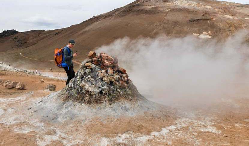 Wir parken am Vulkan Leirhnjúkur, an dem es von 1975 bis 1984 wiederholt zu Ausbrüchen kam. Die Lavafelder sind noch warm und überall raucht es noch, es riecht nach Schwefel und es blubbert an manchen Stellen aus dem Boden.