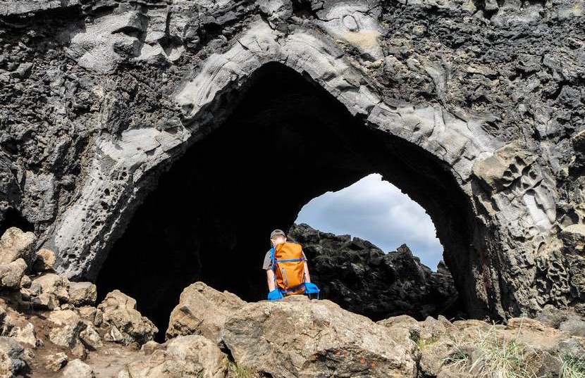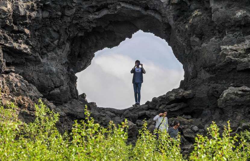 Dimmuborgir ("dunkle Burgen") entstand vor etwa 2000 Jahren. Bei einem Vulkanausbruch floss heisse Lava über ein Feuchtgebiet, und es kam zu Wasserdampfexplosionen, die zu den heute sichtbaren Formationen führten.