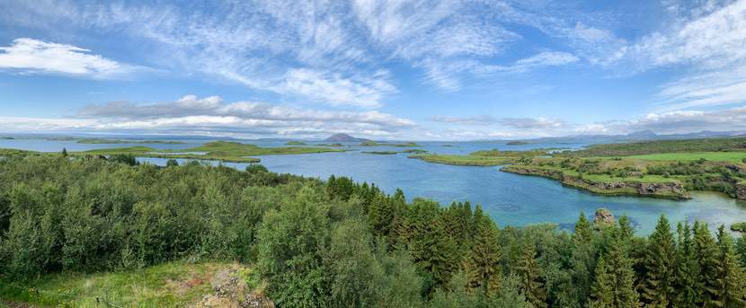 Wir halten bei Höfði am Mývatn, eine für Island untypische Kombination aus Wald und Wiesen mit einem tollen Ausblick auf den Mývatn.