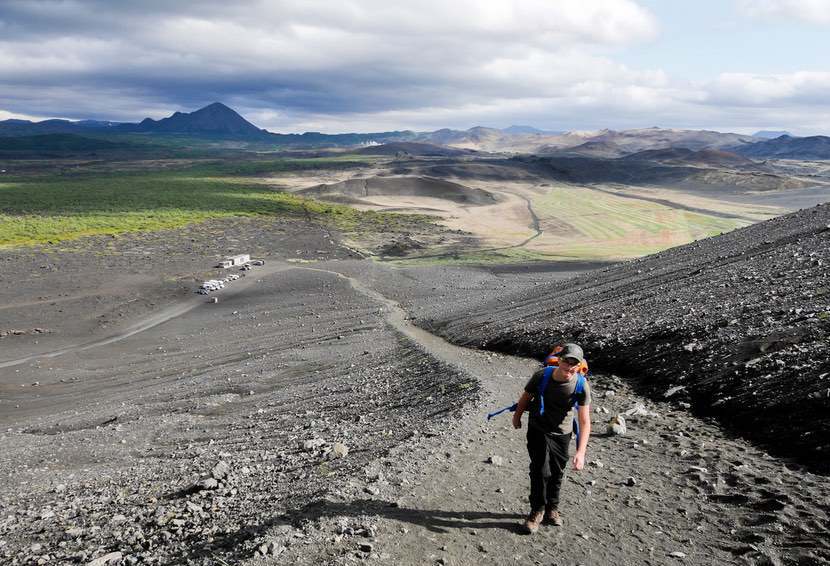 Die erste Station ist der Hverfjall. Der Vulkan ist vor 2500 Jahren ausgebrochen und hat einen 160 m hohen Krater mit einem Durchmesser von rund 1000 m hinterlassen. Wir laufen hoch und werden uns bewusst, wie un-fit wir doch im Vergleich zu den Vorjahren sind. Beide!