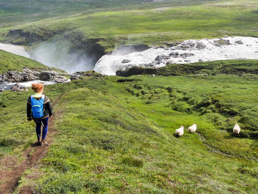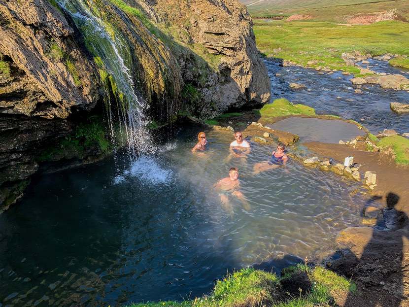 Von hier sind es nur ein paar Meter bis zum Parkplatz. Man folgt dem kleinen, dampfenden Rinnsal und kommt zum Laugarvallarlaug Hot Pot, idyllisch gelegen an einem Fluss, im Hintergrund weidende Schafe.