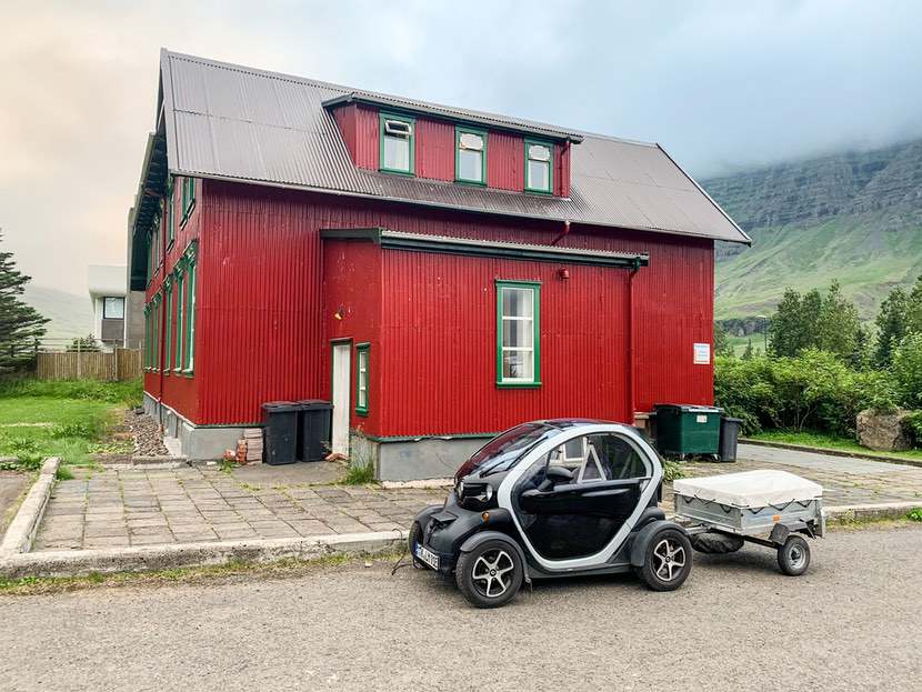 Wir bedanken uns bei Silja für den ausgesprochen tollen Tag und die unglaubliche Gastfreundschaft (bei Stephan und seiner Mutter hatten wir das schon am Staudamm getan) und fahren mit dem Twizy über den Pass nach Seyðisfjörður. 652 Höhenmeter sind zurückzulegen und wir fahren mit sanftem Gasfuß. Weiter oben haben wir für eine Weile dichten Nebel, bevor wir mit 40% Rest an der Jugendherberge ankommen und auch laden dürfen.