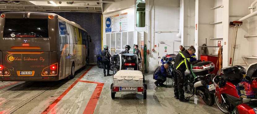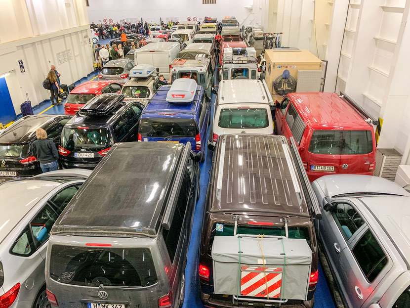 Auf der Fähre dürfen wir, weil wir so klein und süß sind, direkt am Rand neben den Motorrad- und Fahrradfahrern parken.