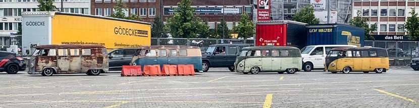 Die alten, extrem tiefergelegten VW-Busse passen zu den Straßenbahnen in Göteborg
