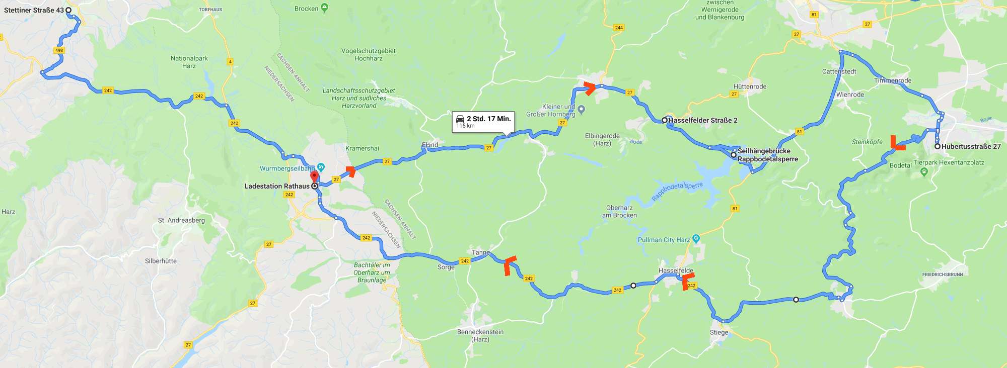 Es ist mittlerweile 17Uhr und wir haben Hunger. Es ist richtig heiß mit 33°! Eigentlich wollten wir mit der Seilbahn fahren, aber unser Elan schwindet. Es ist einfach zu heiß, und selbst den Twizys wird es zu heiß, die Ladung verlangsamt sich, die Ladegeräte gehen über 70°. Weitere Ladesäulen in der Gegend sind nur bis 18 Uhr geöffnet und spärlich vorhanden. Daher beschließen wir, den Rest der Tour ausfallen zu lassen und wieder nach Braunlage zurückzufahren.