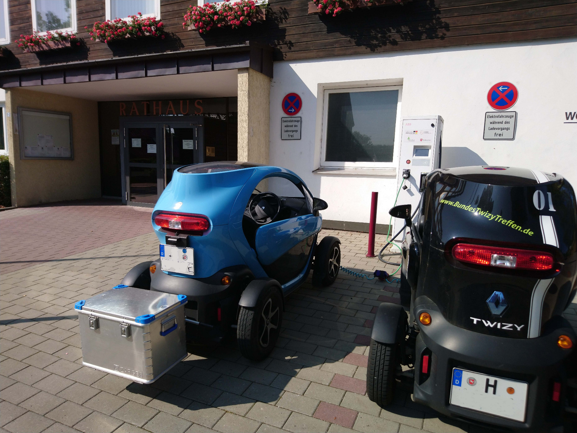 Nach gutem Frühstück und mit vollgeladenen Twizys geht es nach Braunlage. Wir könnten die 60km versuchen durchzufahren, aber nach der gestrigen Nah-Schiebe-Erfahrung machen wir Zwischenhalt am Rathaus Braunlage.