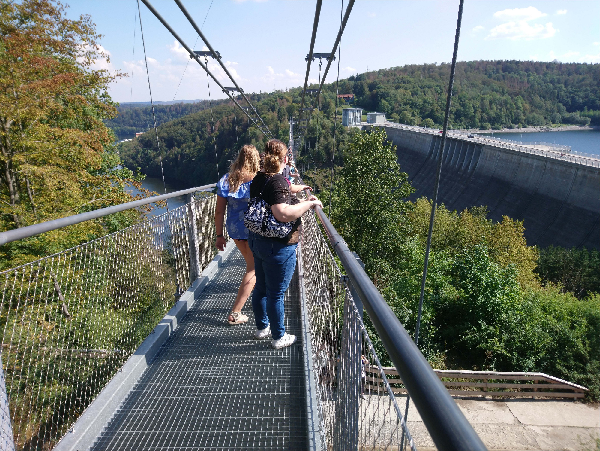 Weiter geht’s zur wenige Kilometer entfernten Rappbodetalsperre mit der längsten Hängebrücke der Welt. Wir parken die Twizys quer am Straßenrand. Es ist laut, weil ununterbrochen Motorrad- und Autofahrer mit aufheulenden Motoren durch den Tunnel vor der Talsperre fahren. Da haben wir nur die Fußgängerhupe!