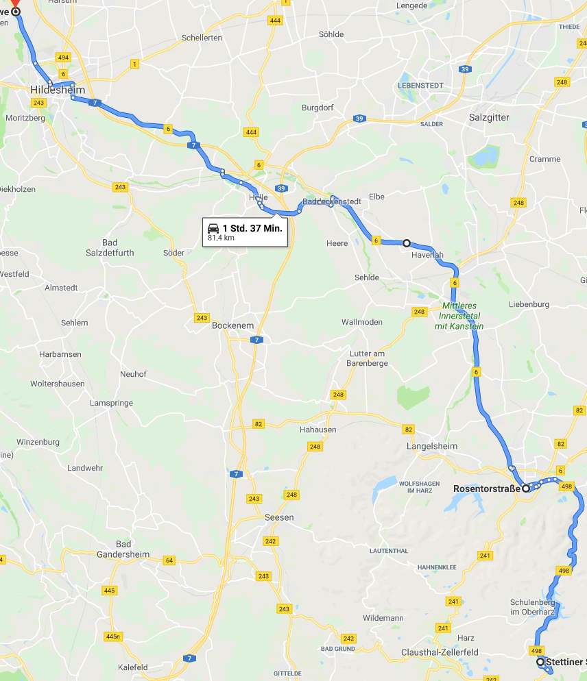 Auf einen Zwischenstopp in Hildesheim verzichten wir, da die Strecke mit 58km Länge ok ist. Typisch für Freitag nachmittag, gibt es auf der Strecke Stop and Go für eine gute Viertelstunde.