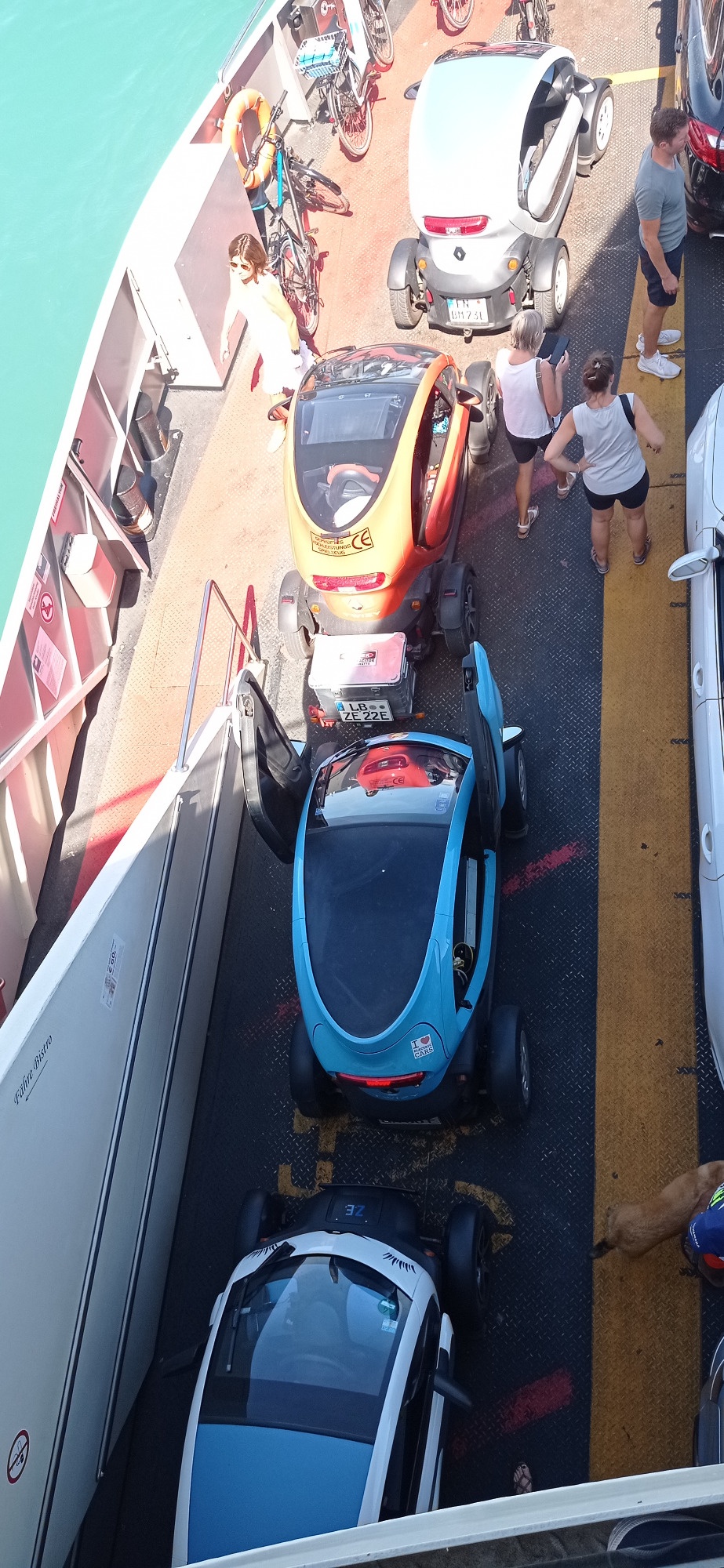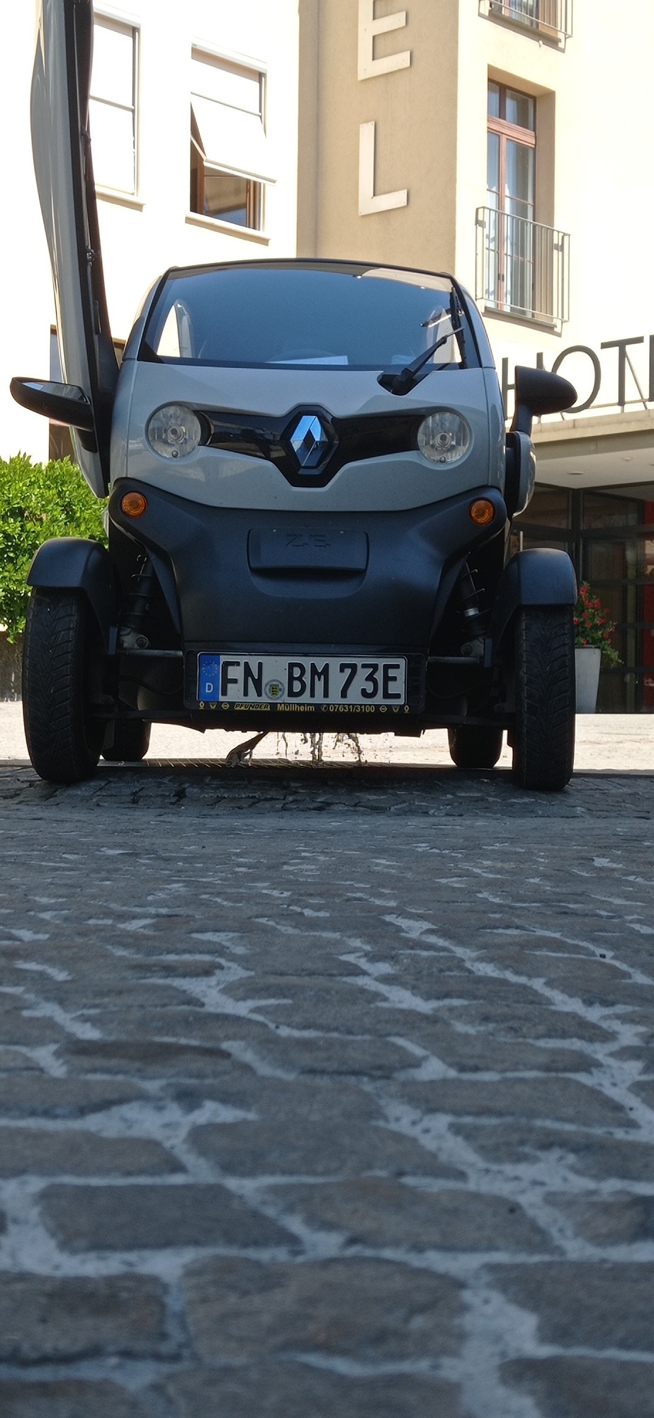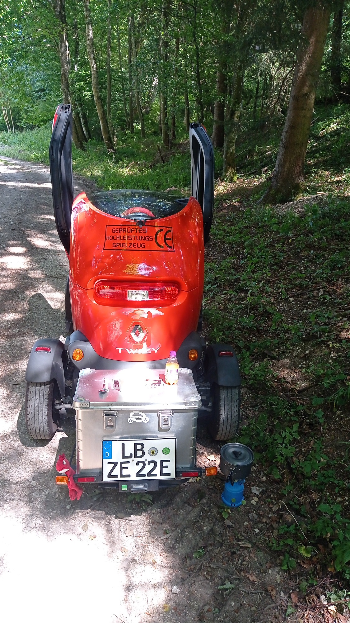Aber der Reihe nach. Die Reise begann am 15.07. nachdem ich meine Frau abgesetzt hatte. Somit war die erste Hürde schon mal geschafft. Nein, nicht die Frau, sondern wie man das ganze Gepäck unterbringen kann und die Frau auch noch in den Twizy quetscht. Dank Transportbox und Spanngurten war das hart an der Grenze der Überladung. Die vergessene Sonnencreme wurde beim örtlichen Discounter noch schnell eingekauft und dann ging es los in Richtung Bodensee. Nach kurzem Nachladen und zwei weiteren Ladestops glühte mein Akku bei 46 Grad vor sich hin, schrie nach Abkühlung. Es war schließlich ein heißer Sommertag und die Ladeplätze lagen nie im Schatten. Der aufgehitzte Asphalt wärmte also den Akku zusätzlich von unten. Die schwäbische Alb war erklommen und in anbetracht der Zeit war eine Mittagspause mit Instandnudeln gerade richtig.