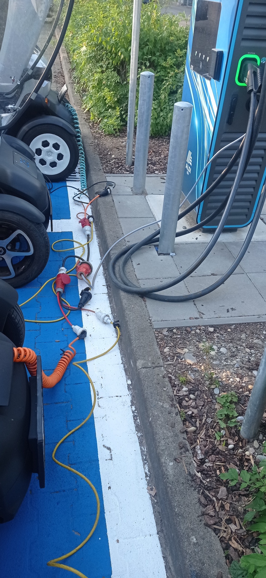 Egal, die Bank half ja aus. Da hier nur die Box mit Typ2 Steckdose zur Anwendung kam, wollte GB seinen Twizy an den Steckdosen der daneben liegenden überdachten Fahrradständern laden. Trotz zwei (!) gut gemeinten Hinweisen, dass in der Schweiz die Leitungen mit nur 13 A abgesichert sind, feuerte GB mit allem was seine Zusatzlader saugen konnten. Wenige Sekunden nach diesen gut gemeinten Hinweisen...Puff..kein Strom mehr, wer nicht hören will