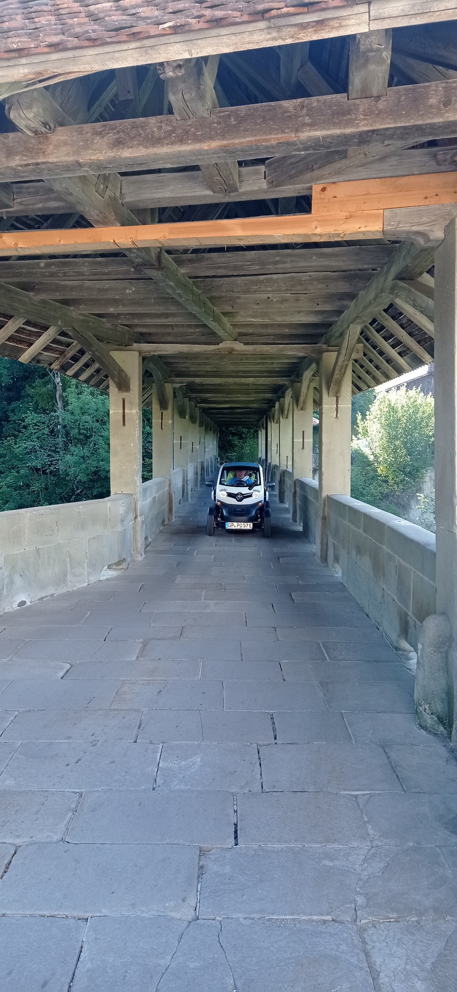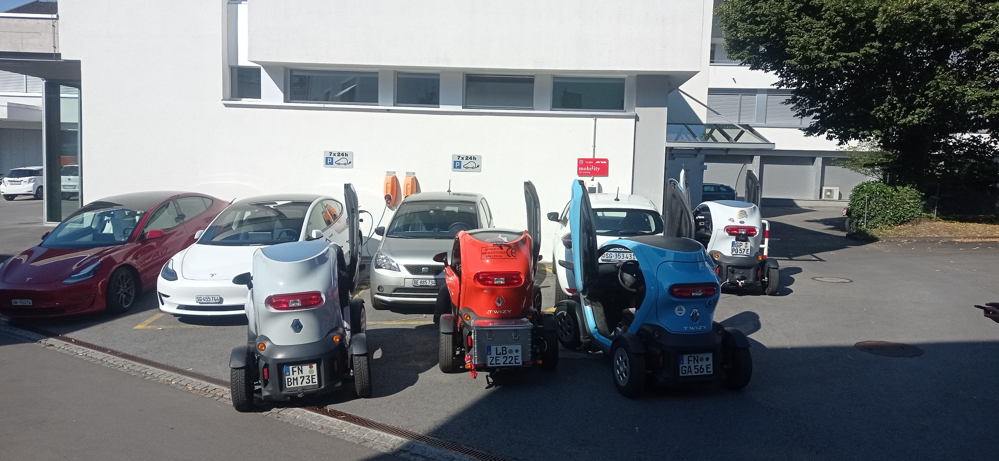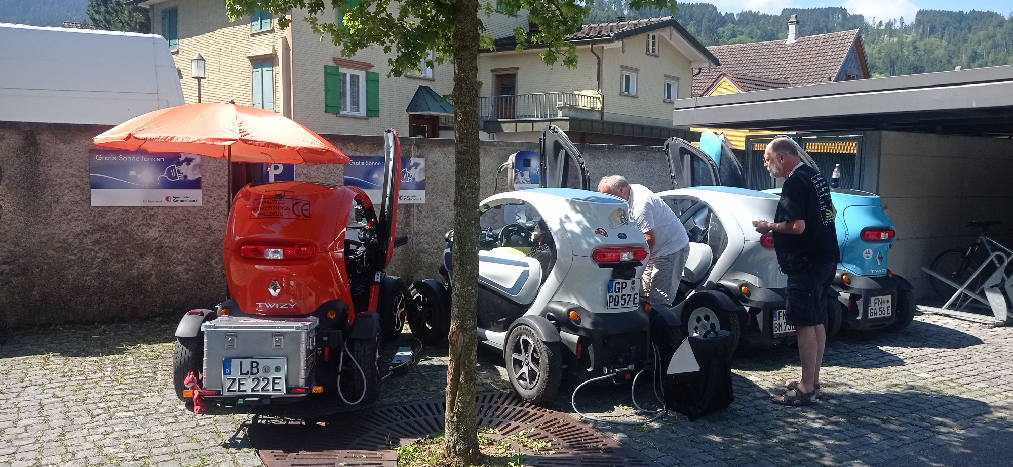 Den Ladestop in Gais ließen wir aus, wir hatten alle noch genug Strom in unseren Twizys. Den nächsten in Appenzell am Maybachhaus erwies sich als Niete. Der angeblich kostenlose Lader erwies sich als mittlerweile Schlüsselgeschaltet, nicht mehr kostenfrei. Also ging es direkt weiter, aber den nächsten Lader fanden wir nicht. Die Kantonalbank Appenzell half aus, hatte dann zwei kostenfreie Ladesäulen. Die waren etwas versteckt im Hinterhof auf dem Kundenparkplatz.