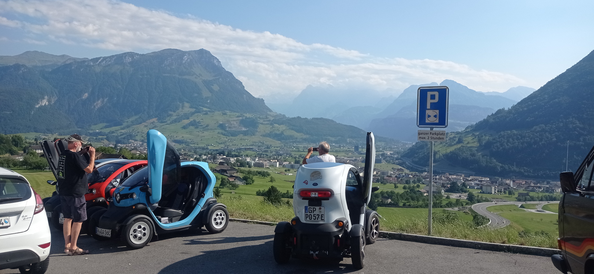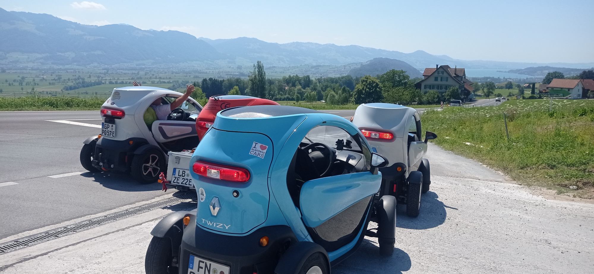 Erwähnen sollte ich noch, ich hab die Tour nicht geplant oder organisiert, das Lob gehört Anderen! Ich bin nur mitgefahren und berichte nun etwas darüber. Geplant war eine Tour über Österreich durch die Schweiz mit drei weiteren Mitgliedern aus dem Forum und später noch mit einem der Gastgeber, auch im Forum vertreten. Mit von der Partie waren Carbonpegasus (CP), GeölterBlitz (GB), ahrmecka (AM), sunneraindle (SR, der Schweizer) und meine Wenigkeit, Kangoo. Nachfolgend verwende ich nur die Abkürzungen. Die Frage die ich mir stellte, passt das...die Schweiz mit Alpen und der Twizy. Um es vorweg zu nehmen: und wie das passt. Ok, kleine Einschränkung, es passt eher mit Zusatzlader.
