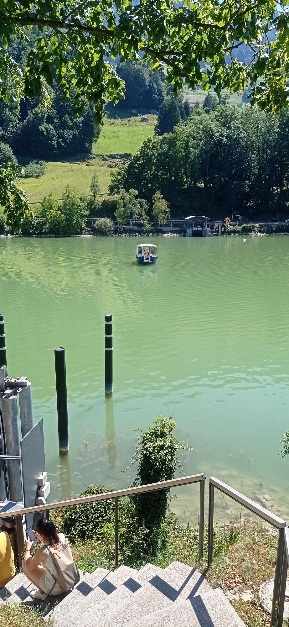Auf die kleine Insel mit Burguine, Kapelle und Restaurant kann man gege 5 SFR übersetzen. Die rein elektrisch betriebene Fähre braucht nur wenige Minuten. Mutige können auch schwimmen. Zumindest auf dem Rückweg war CP so mutig es mit dem Wasser und der Distanz aufzunehmen...auch wenn er für die Rückfahrt schon gezahlt hatte. Das Wasser brachte ihm Abkühlung wärend wir schwitzend warteten.