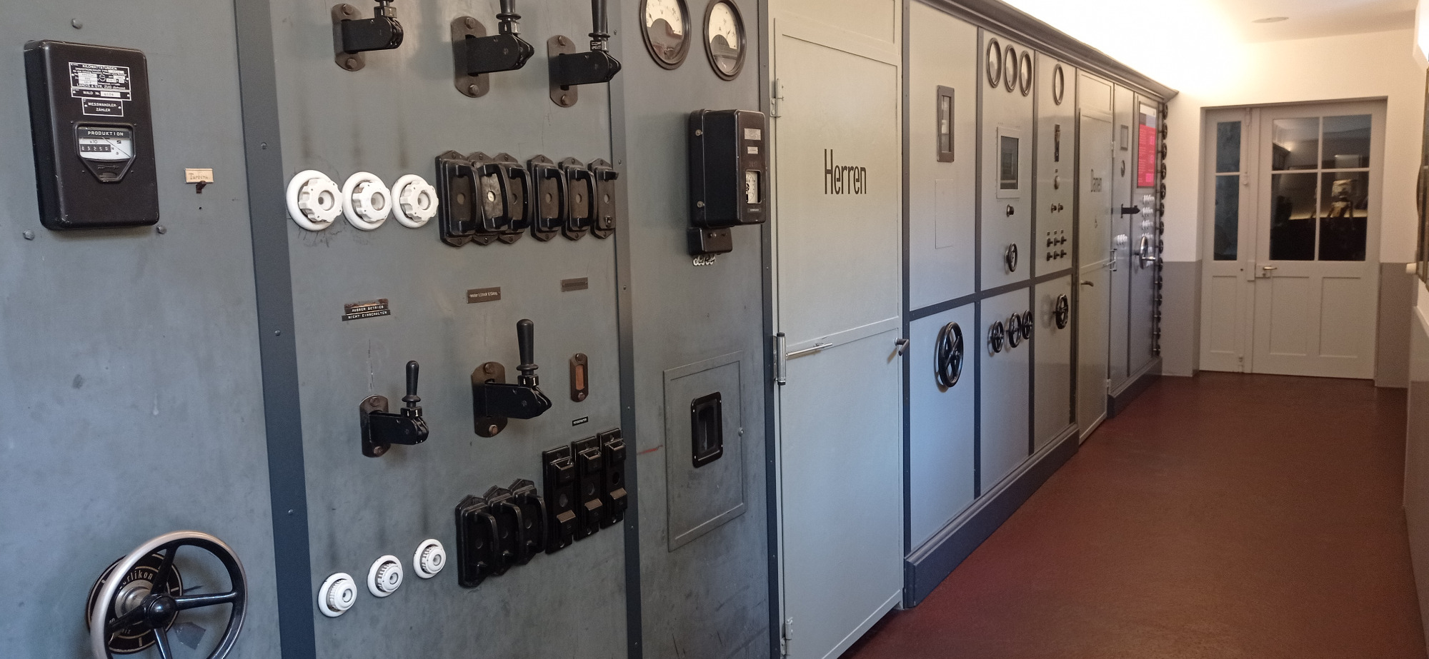 Es ging dann Richtung Einsiedeln zu ein Ladepunkt zum Örtchen "Wald". Dort steht eine alte ehemalige Bleiche, heute ein 3 Sterne Hotel. Diese Fabrik stellte Nähgarne und Stoffe her. Ein Teil des Schalttabelaus des Generatorhauses wurde für den Eingang der WC´s verwendet.