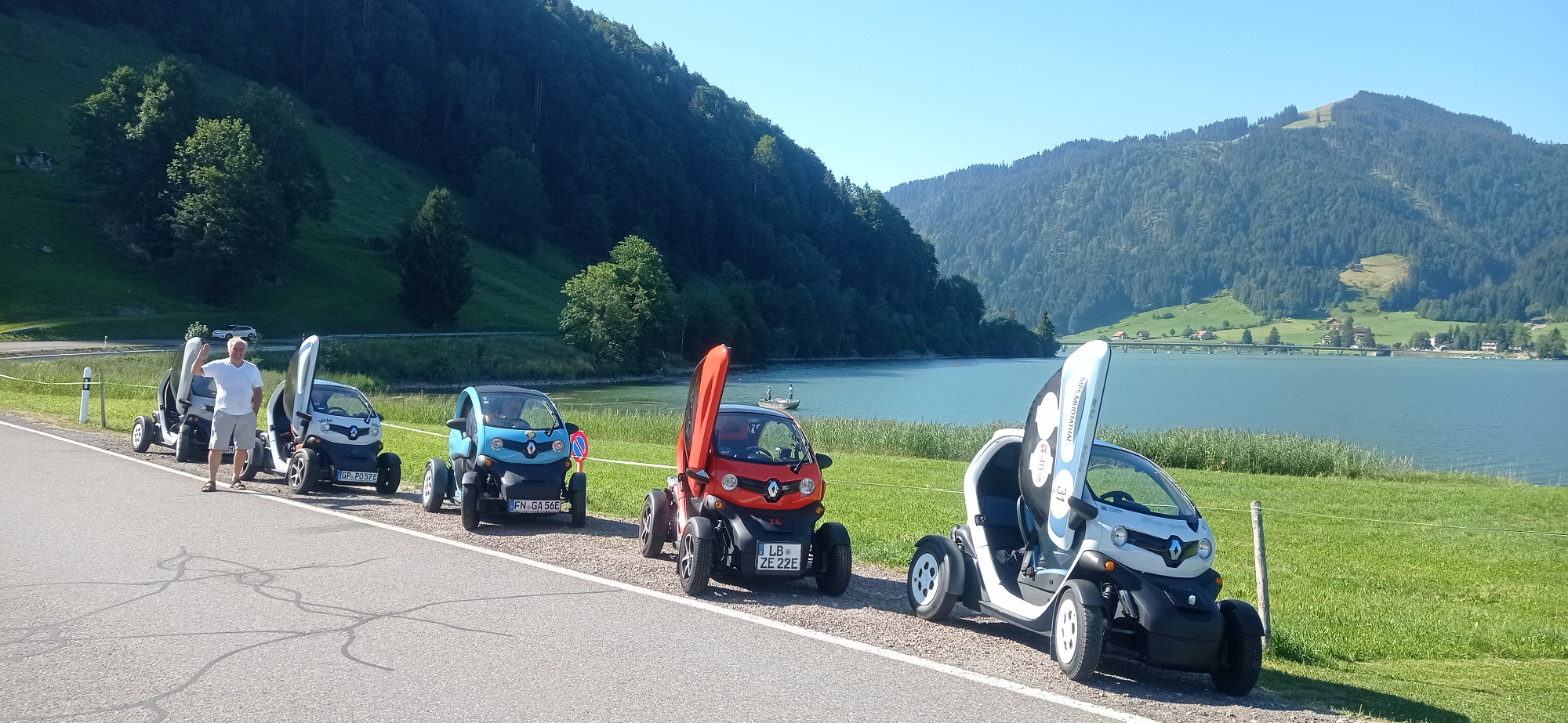 Tags drauf starteten wir nach einem kurzem Frühstück, wieder bei bestem Wetter zu einer kleinen Rundreise. Diesmal geführt von SR. Fünf Twizys fuhren dann entspannt über tolle Straßen und Serpentinen. Es ging über einen der höchsten Punkte der Reise, auf 1400 Meter (Ibergeregg) nach Oberiberg, Unteriberg,