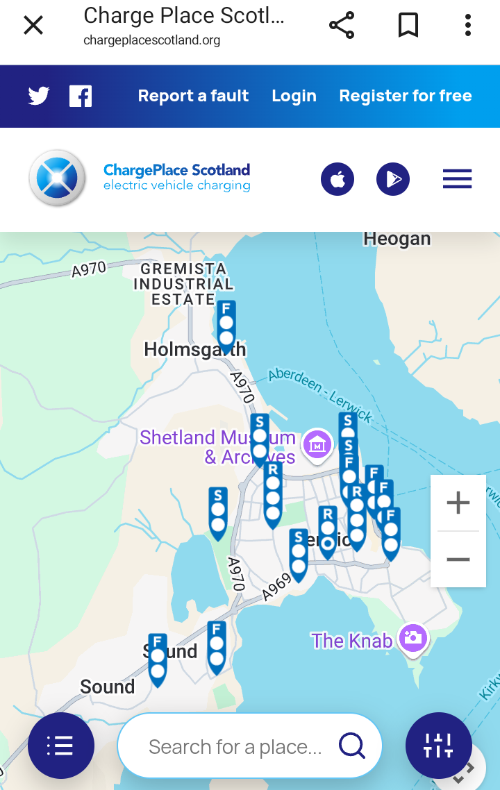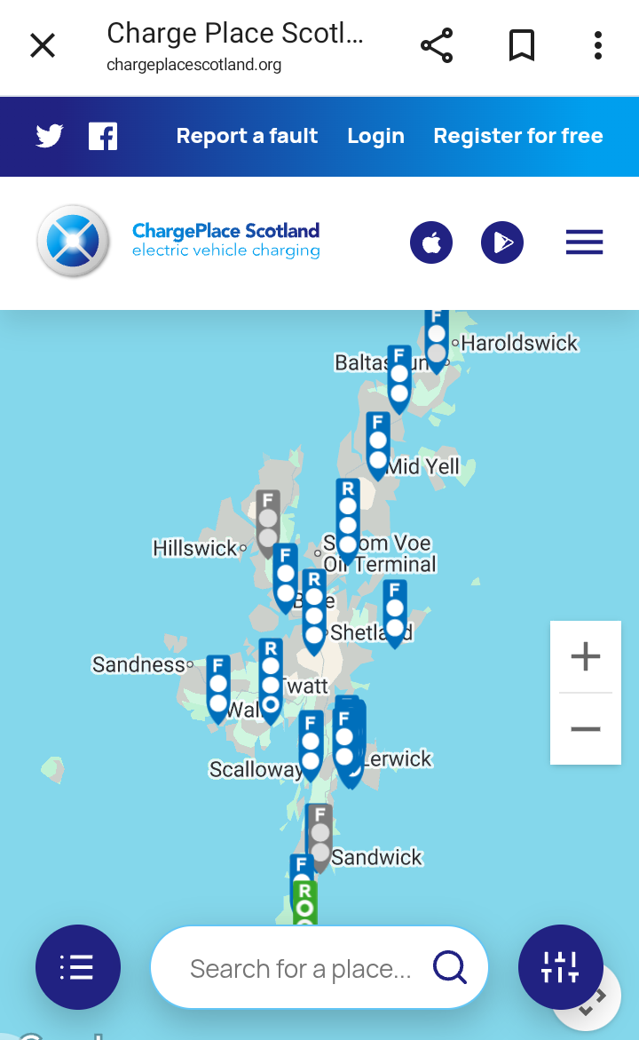So far, we haven't had any charging problems. The network of Chargeplace Scotland charging points is sufficiently dense (I'm attaching two screenshots to this message, one showing the points in the capital Lerwick and the other their general distribution across the archipelago). In order not to be dependent on a sometimes unreliable cell phone network (and not to be able to charge if there is no network coverage