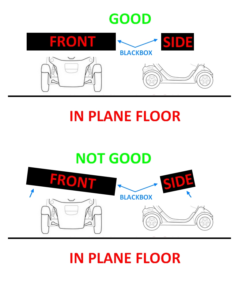 Also don't forget to allign the blackbox in plane respect to the floor (wheel axises), both frontaly and lateraly (see picture). Otherwise inclinations measures will be wrong
