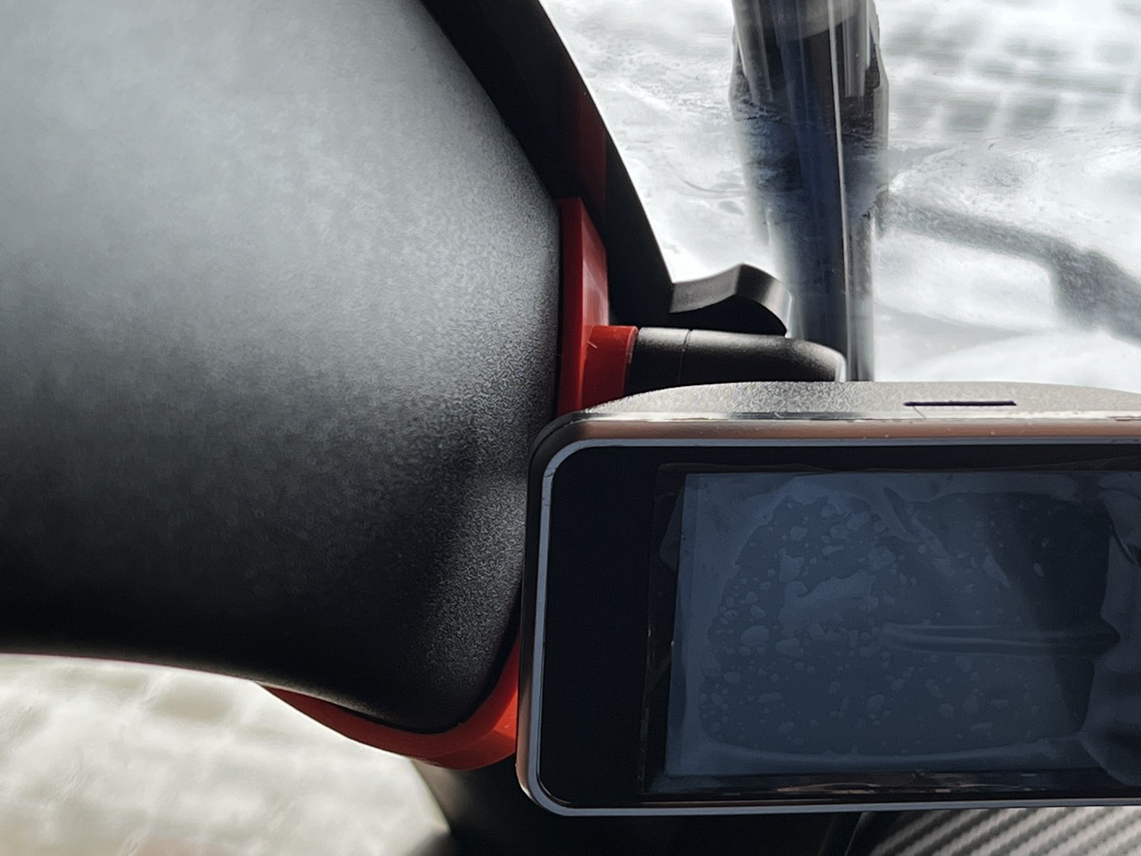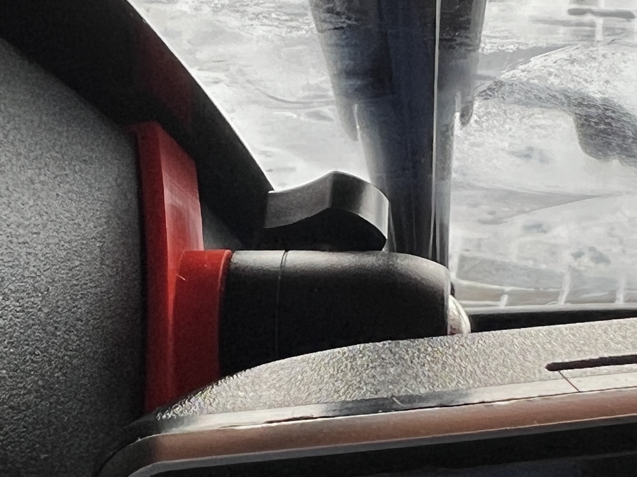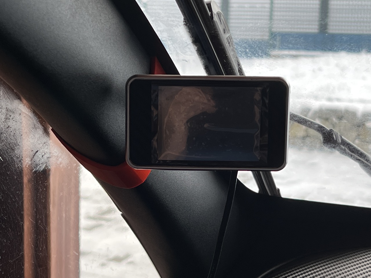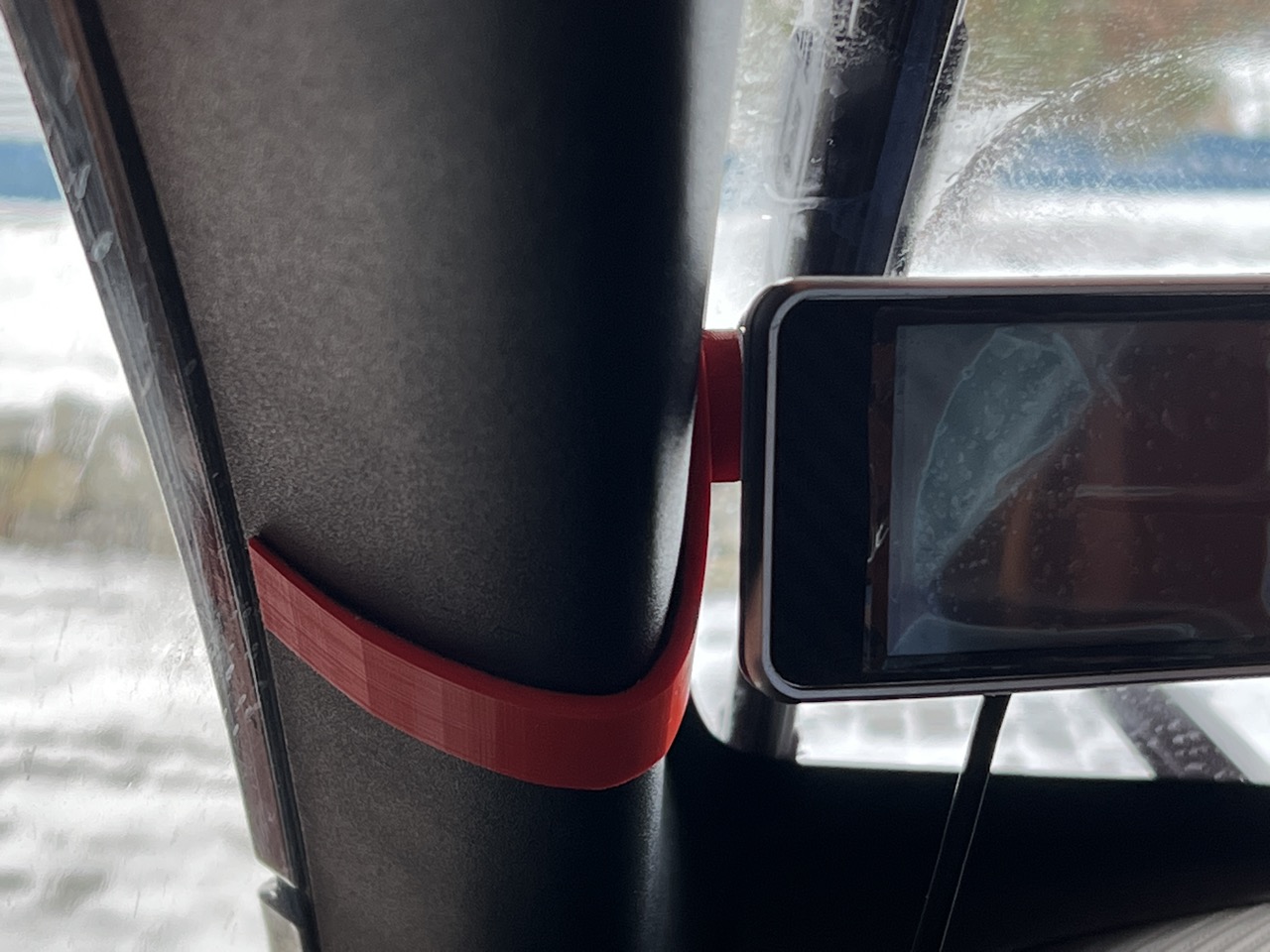 Zwischen dem Plastik der A-Säule und der Halterung ist ca. 1mm Platz für eine Filzeinlage oder/und einen Klebestreifen. Die Halterung wird später noch breiter (wenn notwendig) und noch hübscher :). Wenn sie nicht funktioniert kann es aber auch sein, dass das Projekt wieder verworfen wird. Aber mein Twizy ist jetzt dummerweise erstmal für den Winter eingemottet (12V Batterie ausgebaut).