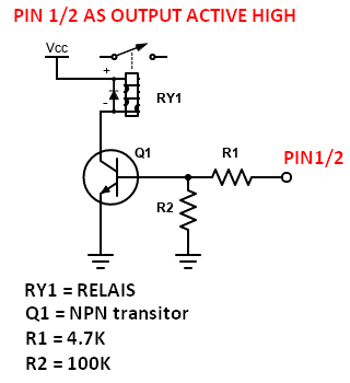 In the picture below you see how you can connect a relais, throght a transitor, on these pin.