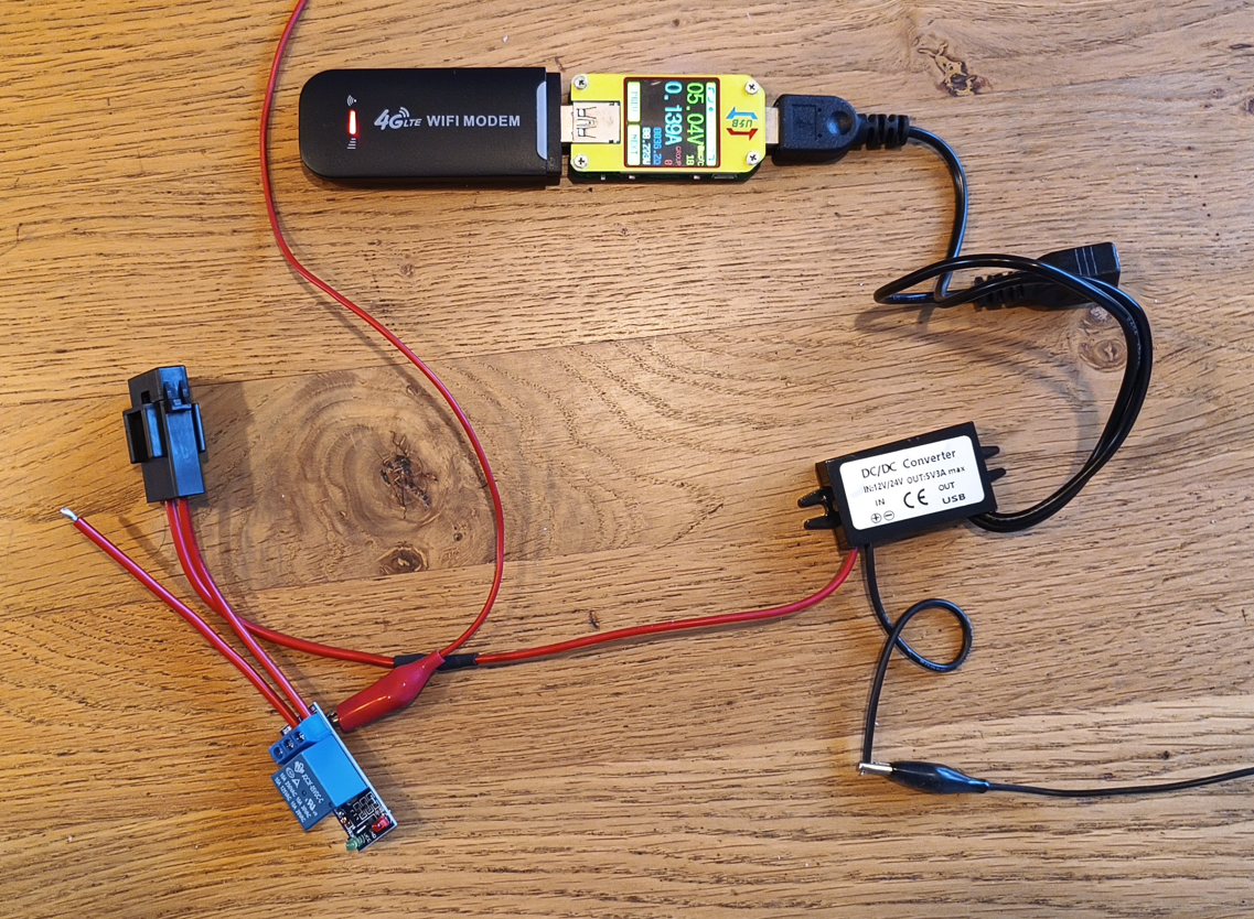 I'll think about it for a bit, but I'll think I'll go for the relay + 12V-converter setup, like in my photo. I think there's a good chance the 4G modem could consume peaks of more than 300mA when 4G and wifi are active, and I don't want to blow a fuse in my ToM.